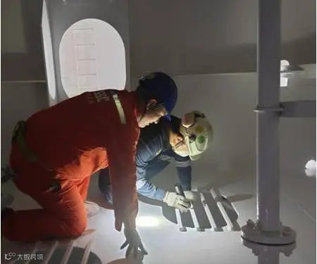 在得知脚手架采用向上传递拆卸的方式后,施工员葛晓文灵机一动,提出货舱上下同时施工的想法。这一想法不仅能提高施工效率,还能有效缩短工期。葛晓文带着详细的施工计划和安全保障措施,与船东进行了深入的沟通交流,经过耐心的解释和论证,船东最终认可了这个方案。