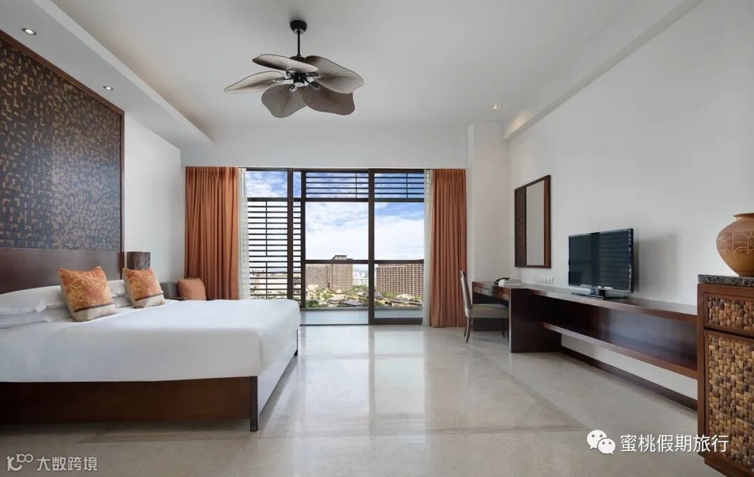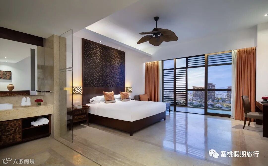 是三亚湾红树林度假世界的地标酒店,总共798间/套客房。房间面积53平方米-420平方米之间,室内设计出自名家,房间内艺术品可售卖。酒店拥有挑高50米的大堂,可同时供千人办理入住及离店手续