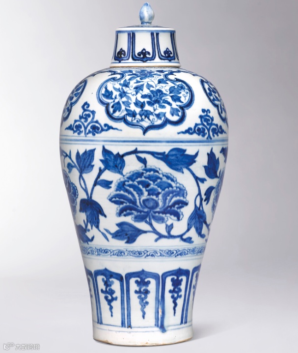 在元青花瓷之中,梅瓶当属于最具代表性的器型之一,自明代以来即被视为名品。到了今时今日,更因存世数量极其稀少,而为收藏家趋之若鹜,价值非凡。最为难得的是,此瓶历经数百年,依然保持原盖,未有遗失。瓶盖顶部还带有宝珠钮,至今依保存完好。