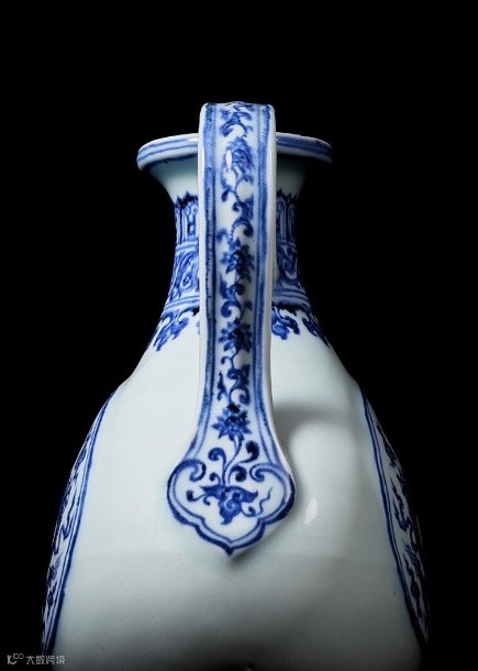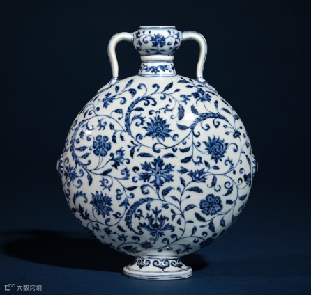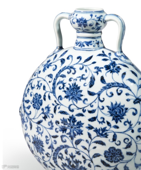 观其器形、纹饰,本品可谓永乐皇帝对外政策下之产物。烧造于景德镇御窑,扁壶质量精美,釉色匀细,器形比例和谐,火候控制精确,青花发色浓艳,纹饰笔法娴熟,布局缜密均衡。