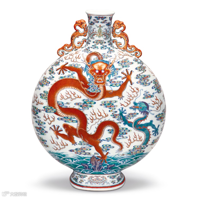 清乾隆 斗彩苍龙教子图夔龙耳抱月瓶 六字篆书款