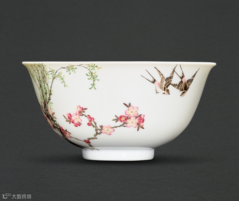 此珐琅彩盌,外壁一面绘杏林春燕图,描写细腻自然。柳条抽枝散叶,嫩绿里缀金黄叶芽;杏花开绽,枝间芽点零落。双燕游嬉于花叶枝桠间,前者回首,后者前看,二者如佳偶相望,情意绵绵。整体既寓春临大地,又托比翼之愿。