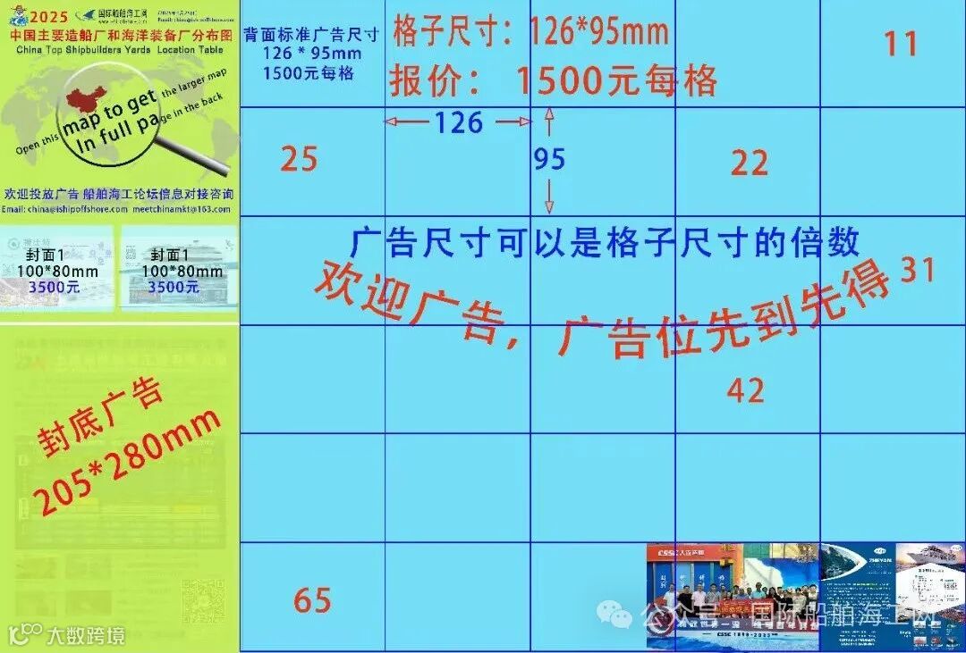 地图数字为满一格(尺寸为105×72mm 宽*高),1、16和都是3500元人民币一格位置,1500元一格同样大小也可在地图背面选择发布(位置先到先得,额满为止,图多可优惠)。该图不但将在会上免费赠送,会后活动中尤其是拜访船东、船厂、设计公司等时,还将继续赠送发放。(邮寄索取该图需要付费物流处理,298元2份,有发票。免费赠送只在我们参加展会上发放,送完为止。)