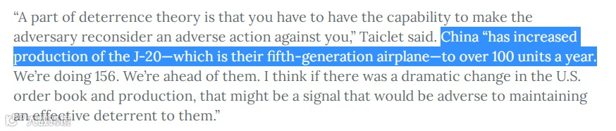 吉姆·泰克莱特表示,“以有意义的速度生产F-35这样的先进战斗机可以增强对中国的威慑力”,按照所谓“威慑理论”,“你必须有能力让对手重新考虑对你采取的不利行动”,“如今中国已将歼-20的产量提高到每年100多架,我们在2024年的产量是156架,暂时领先于他们。但如果美国的订单和生产发生巨大变化,将是一个不利于保持对中国的有效威慑的信号。”