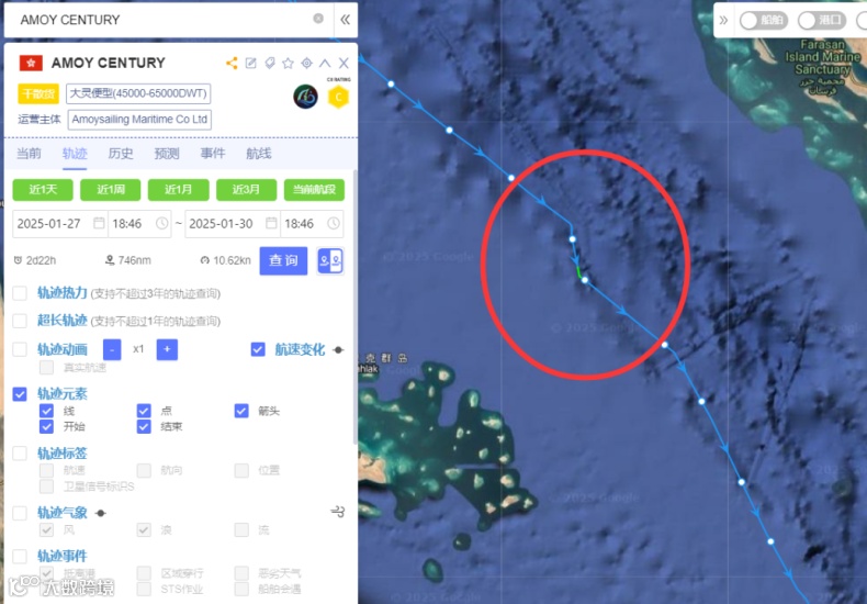 图3 “AMOY CENTURY”轮营救绕航轨迹