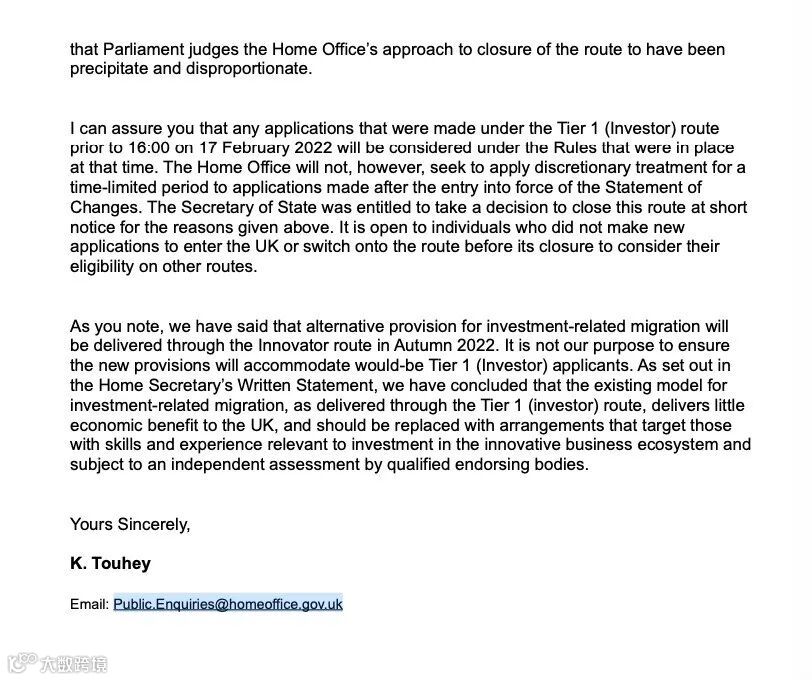 关于在未来内政部如何通知移民规则的变更,内政部仍然打算遵守通常的惯例和规则(即在颁布政策变化和具体实施之间留有缓冲时间),除非有最令人信服的理由不这样做,就像这次的情况一样。此外,尽管对Tier1 投资移民路线的更改是立即生效的,但议会仍然可以反对更改声明。到目前为止,议会还没有提出反对意见,主要是鉴于Tier1投资移民路径关闭后的事宜,以及政府对俄罗斯实施制裁的行动,议会某种程度上是认可内政部关闭路线的做法的。
