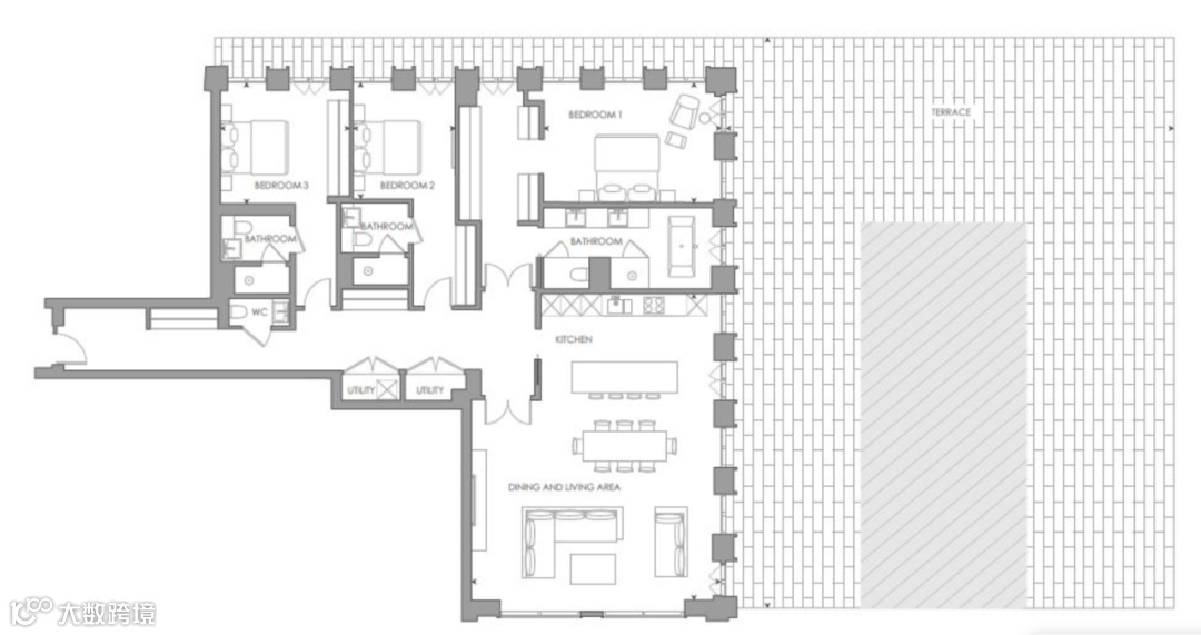 项目设计由Latitude Architects建筑事务所和Create Interior Design室内设计事务所联袂打造,顶层公寓自带1023平方英尺的景观露台,站在户外露台,伦敦大都会美景尽收眼底。