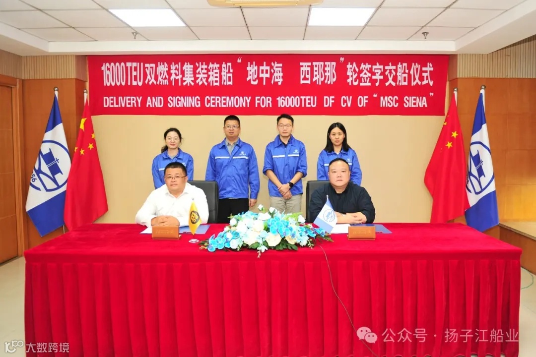 10月21日,地中海航运(MSC)驻扬子鑫福现场办经理羊海涛先生,我集团总经理助理兼扬子鑫福总经理杨雪彦先生分别代表双方签署交船文件。“MSC SIENA”轮的顺利完工交付,将进一步巩固和强化我司在大型集装箱船建造领域的市场地位。扬子江船业将持续深化推进环保理念和技术在船舶建造上的实践应用,携手合作各方,为航运事业绿色健康、可持续繁荣发展贡献力量。