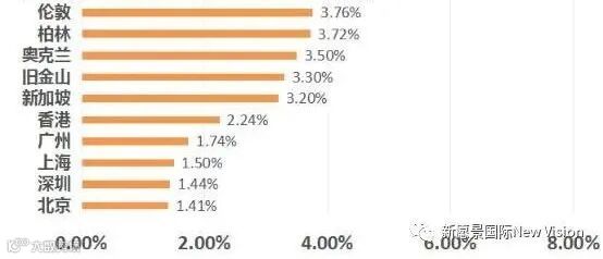 相比起来,中国各一线城市的租金回报率却出奇的低。此次进入排名的中国城市分别是香港、北京、上海、广州以及深圳。中国五大城市包揽了榜单后五位,其中北京的租金回报率最低,仅1.41%。伦敦的租金回报率达到3.76%。