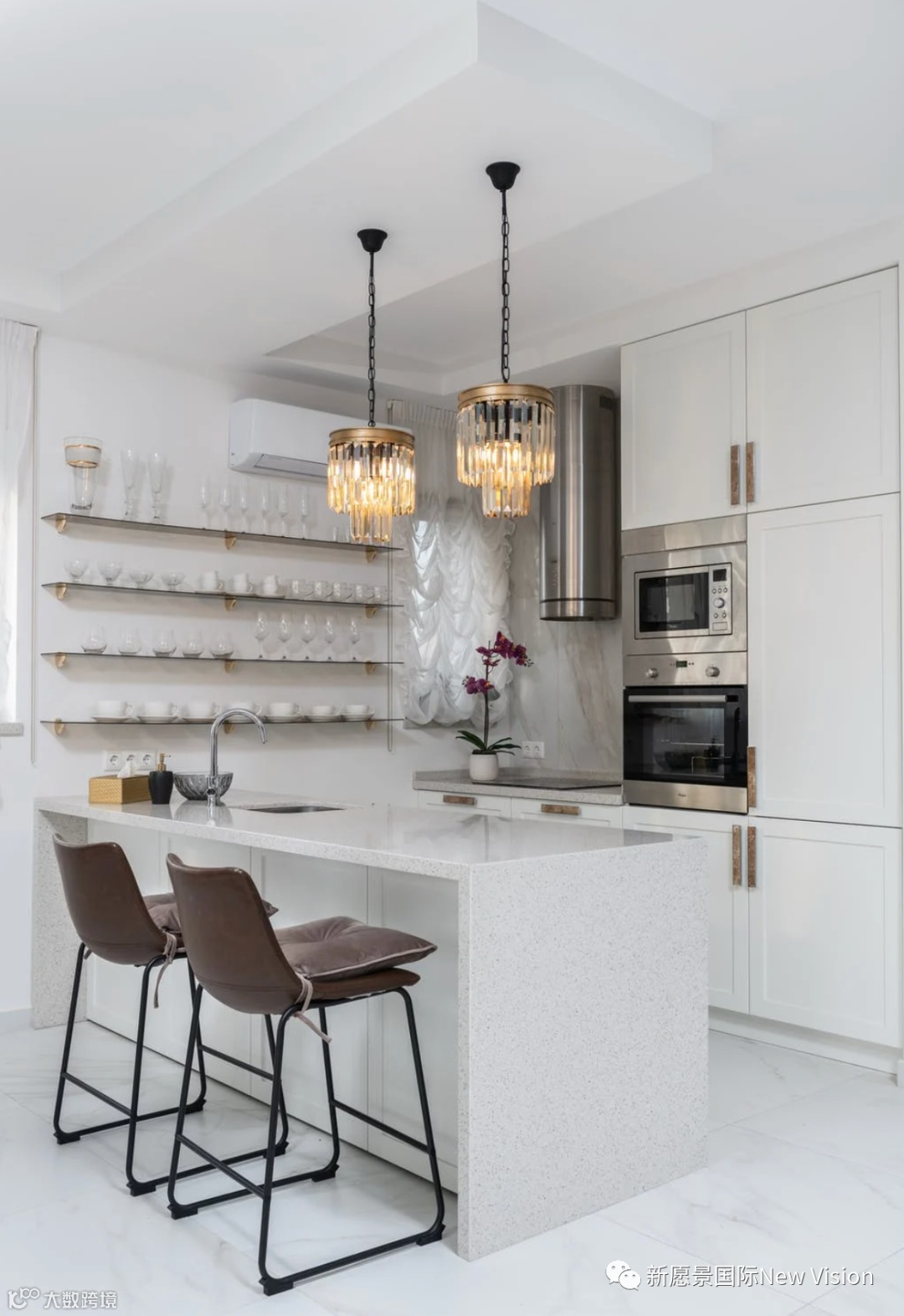 2. 厨房常用品:如灶台、烤箱、各种碗柜、储藏柜、油烟机、冰箱等全部一应俱全;