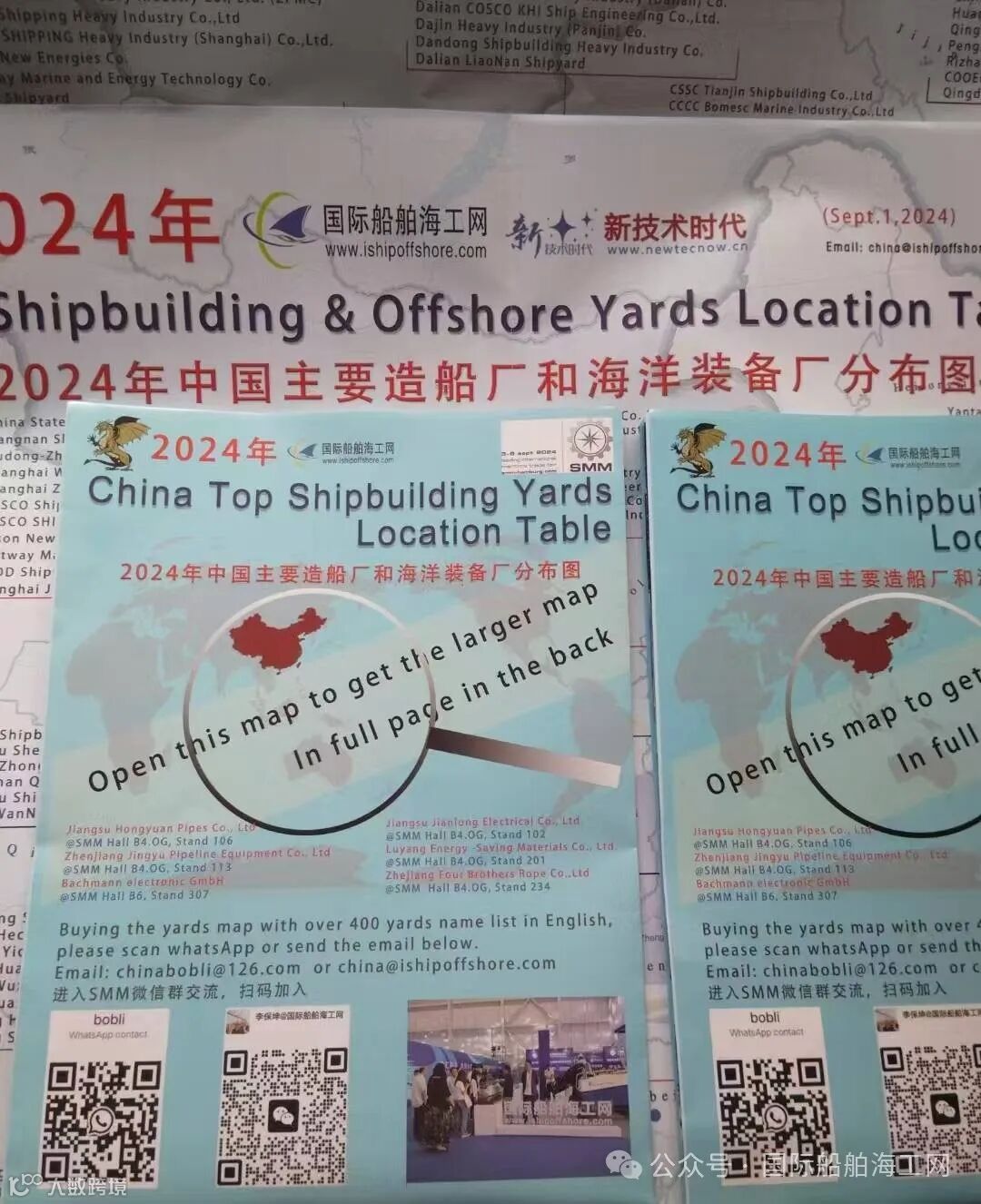 2024年9月3日-6日,全球最大的造船海事展览SMM在德国汉堡贸易博览中心盛大举办,汉堡海事展是目前世界造船领域规模大、层次高、影响力强的专业性海事贸易展览会,被誉为“世界第一大造船海事盛会”。本届展会吸引了来自约100个国家和地区的2300家参展商。其中中国参展商约200家。新一版赠送版全英文龙版中国造船地图也在汉堡海事展SMM上免费赠送,受到好评。目前新一版赠送版中文龙版中国造船地图正在编辑,计划于10月28日发布,1千元人民币起就可在上面投放广告。