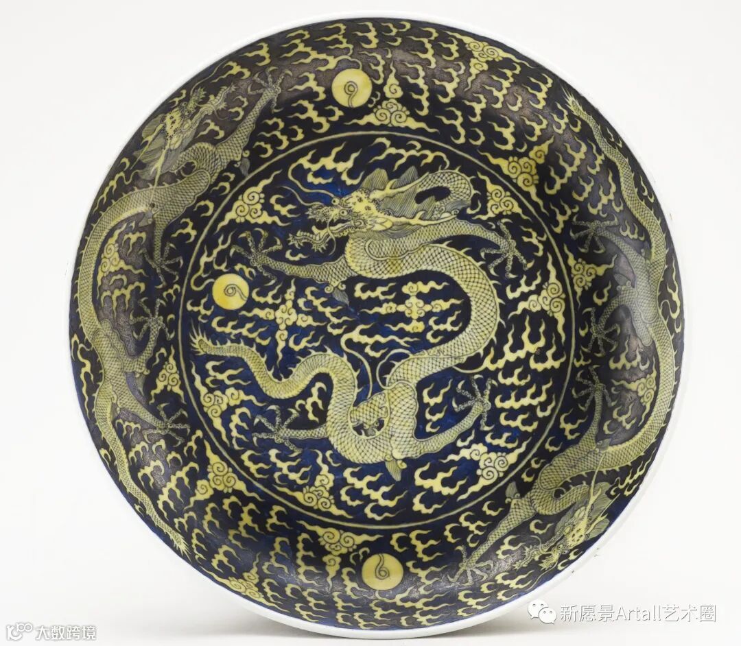 清光绪御制 蓝地黄彩云龙纹盘一对 约1875-1903