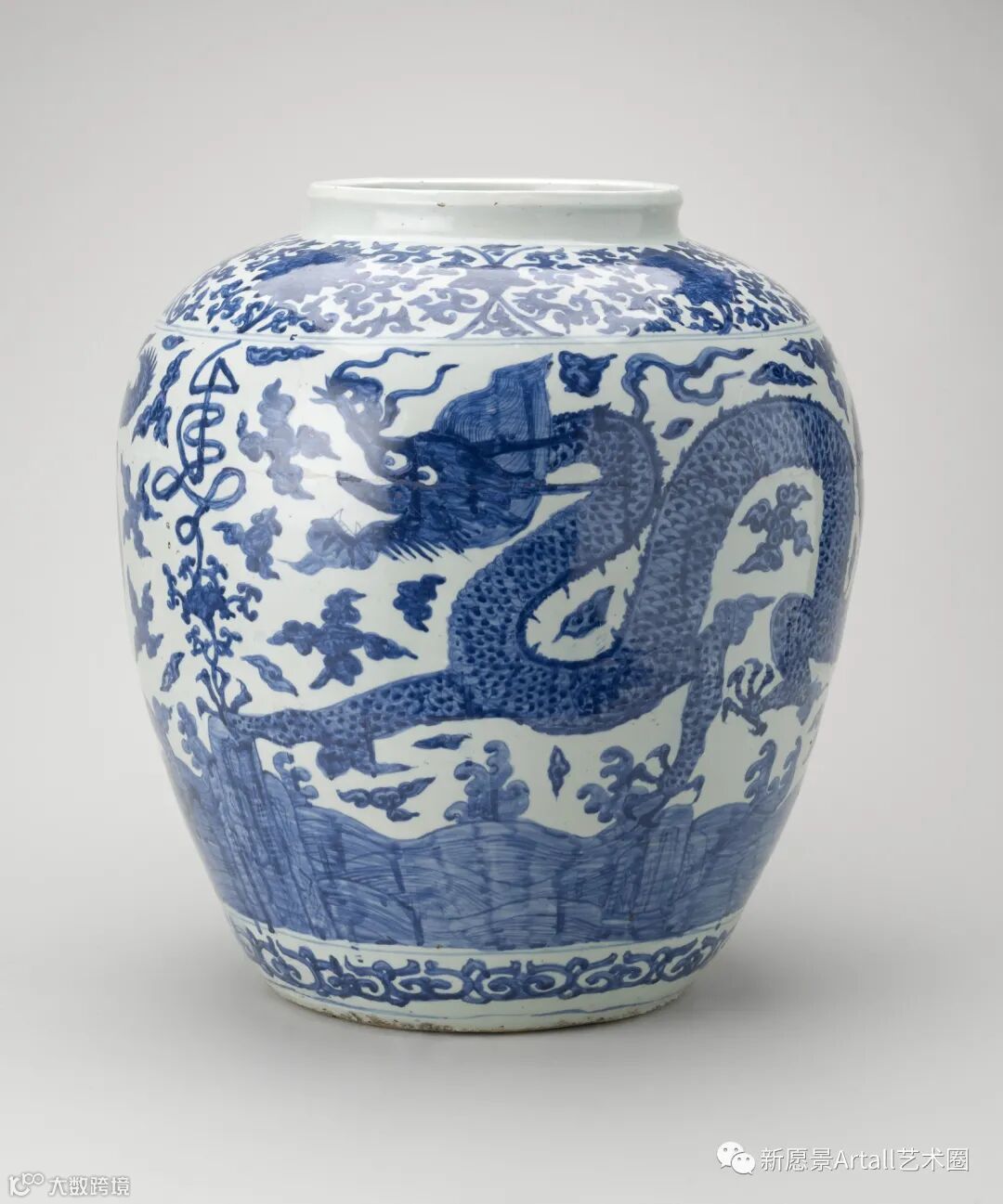 皇室收藏中年份早期的明代青花瓷典例之一,饰以皇权象征的五爪龙和印款,罕见的是,印款出现在底部,而不是像同类青花瓷般,印款出现在肩部。