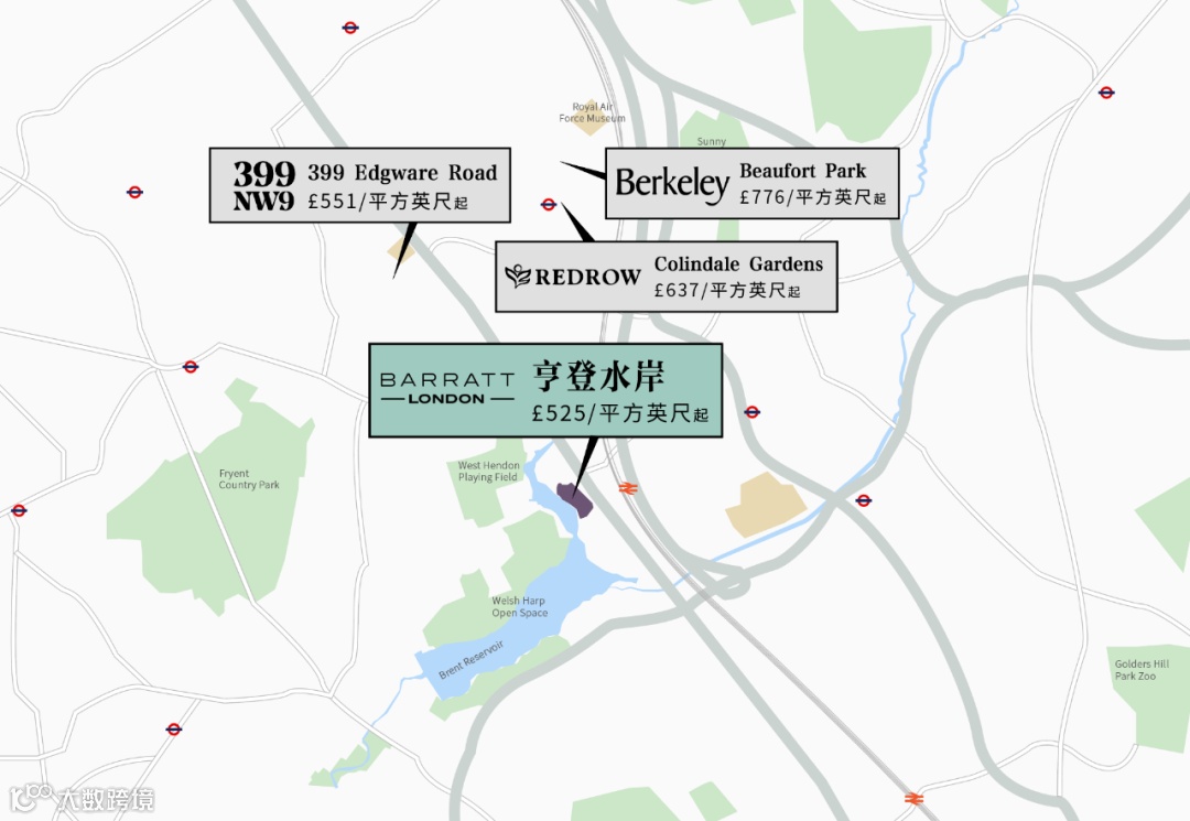 我们进行亨登水岸周边、巴内特区域新房零售价格的市场调查,亨登水岸直接临湖均价仅有£525镑每平方英尺,折合成人民币不到¥5万,而巴内特的其它新房均价挂牌至少从每平方英尺551镑到776镑不等。亨登水岸绝对是您的投资佳选。