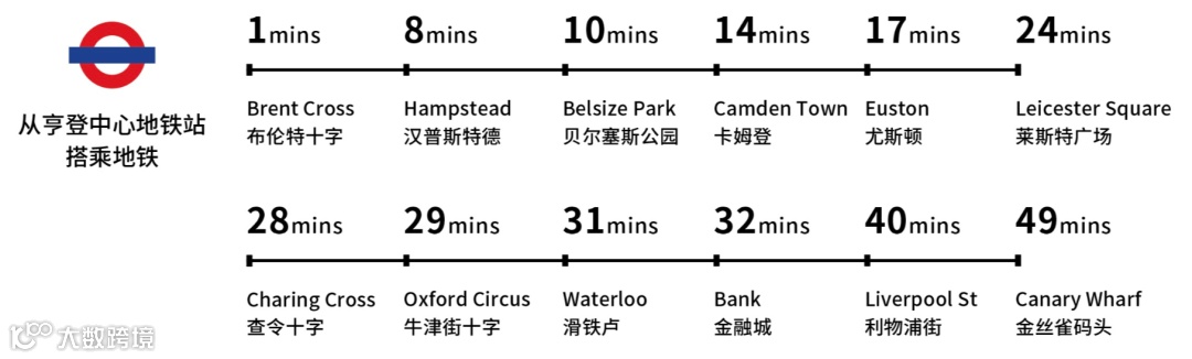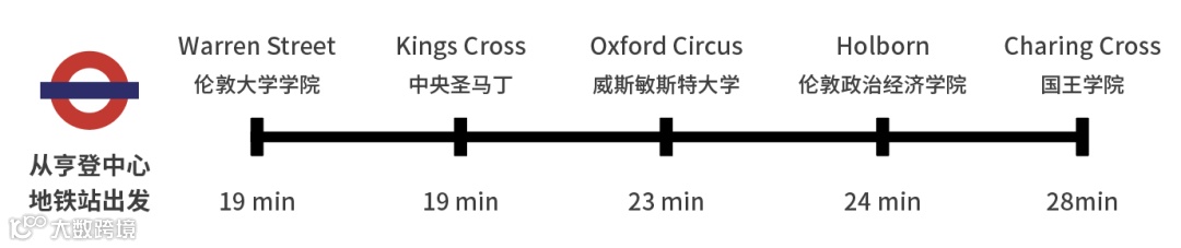 纵横南北的伦敦最主要地铁线Northern Line(黑线)快捷通勤伦敦重要商务区、大学以及购物中心。17分钟直达尤斯顿Euston,28分钟到查令十字Charring Cross,31分钟到金融城Bank。