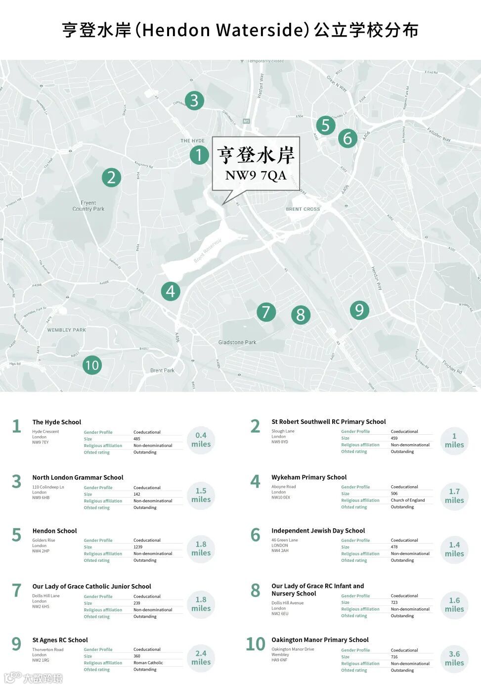 不仅如此,亨登水岸项目周围超过10所Ofsted评级优秀的学校,其中两所评级优秀的学校——The Hyde School与Woodfield School均步行可至。