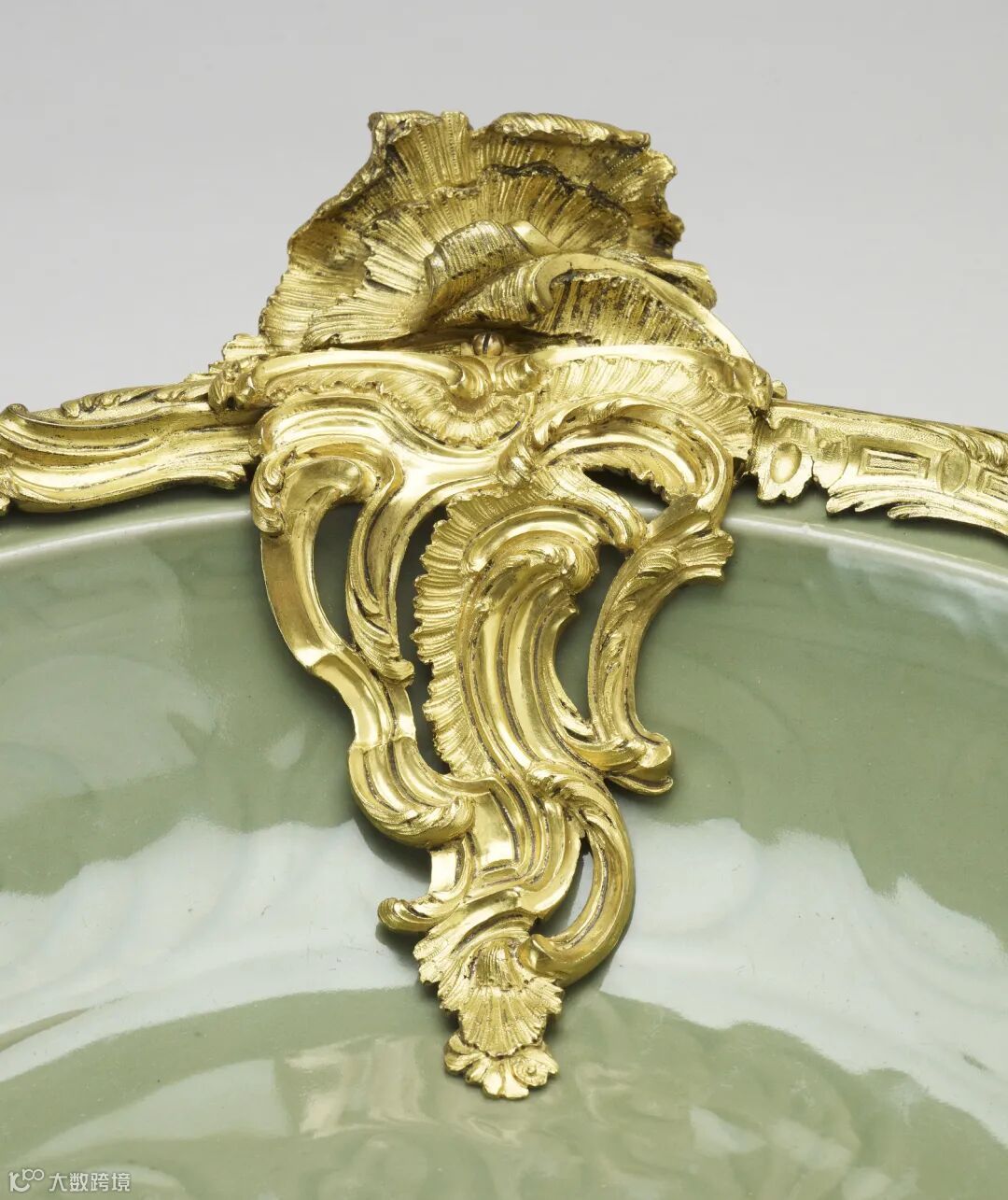 这件艺术品的装饰反映了18世纪下半叶在法国盛行的活泼自然主义和不对称风格。盘子边缘和侧面的装饰质量非常高。不同寻常的是,两侧的铜鎏金装饰仿佛是从碗的边缘翻滚到碗的中心,这大概是为了隐藏铜鎏金镶接底下的裂缝。