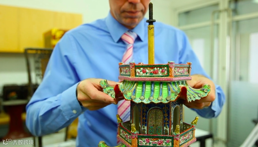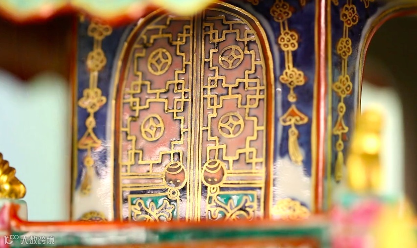 釉下蓝、粉彩,加以搪瓷和铜鎏金镶接瓷塔