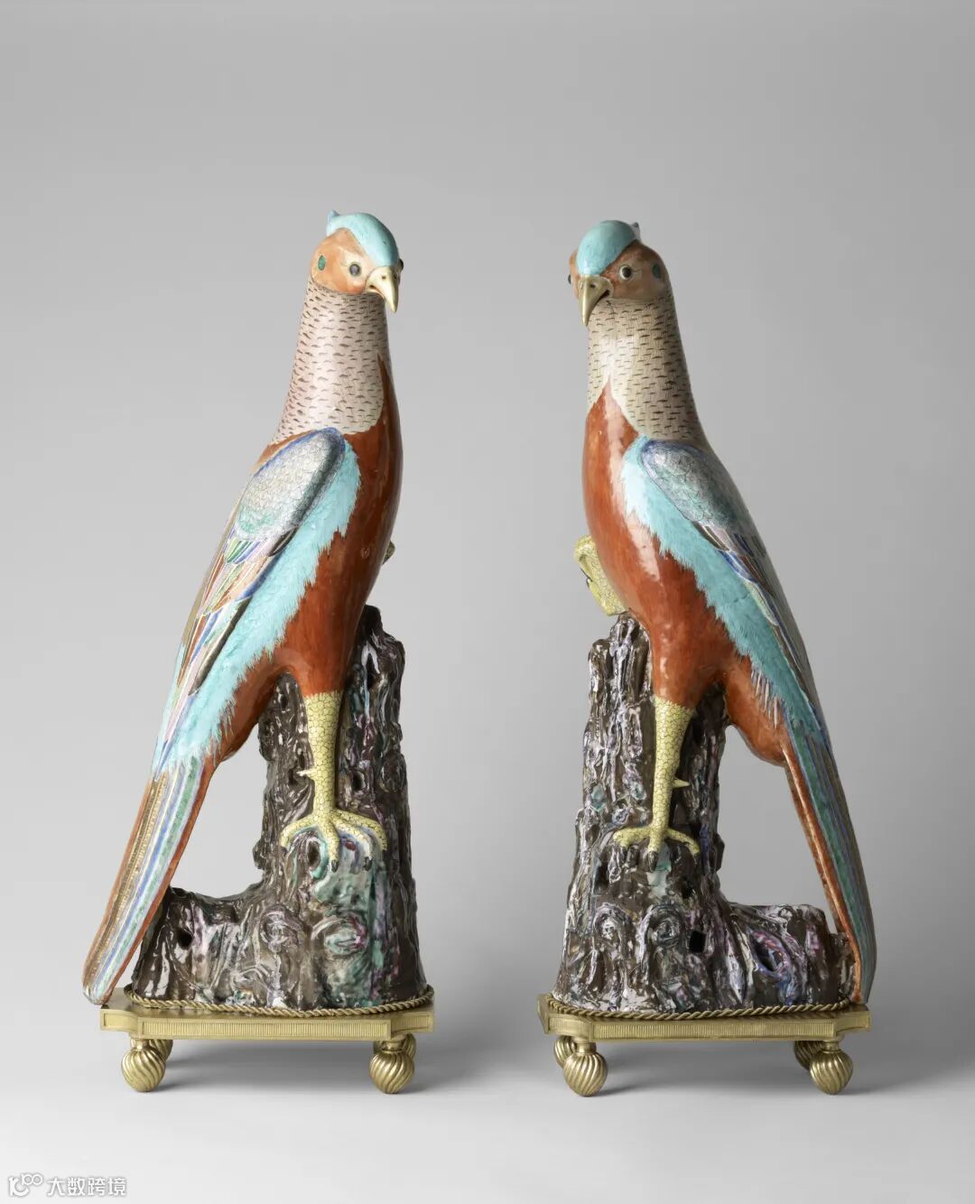 随着17 世纪末出口到欧洲的白瓷摆件大受欢迎,欧洲人为了迎合这股潮流,生产了各种各样的摆件,其中许多是基于西方模型的,例如这个粉彩珐琅配以法国铜鎏金装饰的中国瓷雉。
