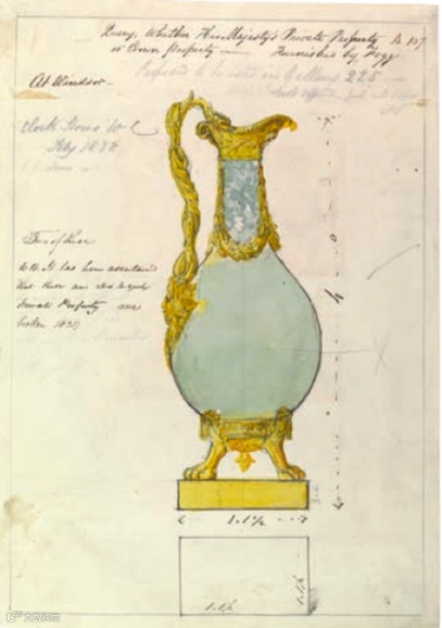在皇室画报名录中可以找到一系列水彩画作(如下图),记录着一双有着几乎一样铜鎏金镶接执耳壶,是Morel & Seddon在1826年至1829年间专为国王乔治四世而设计。