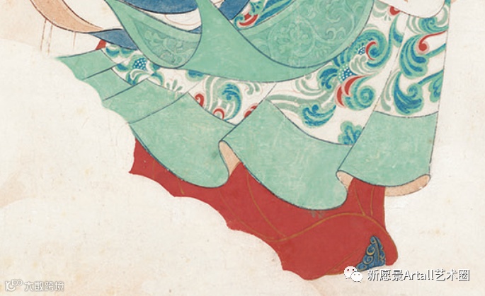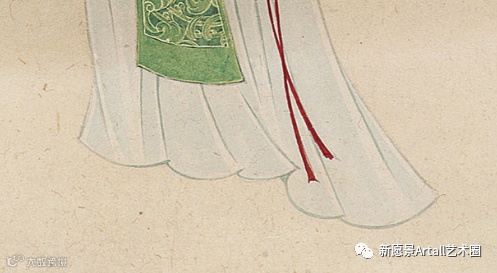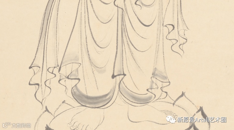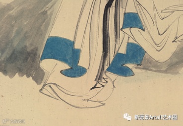 同样以张大千先生为例,大家注意大千先生很多人物画在服饰下摆得部分,也就是一个长线条收尾的部分往往会有连续的转折出现。