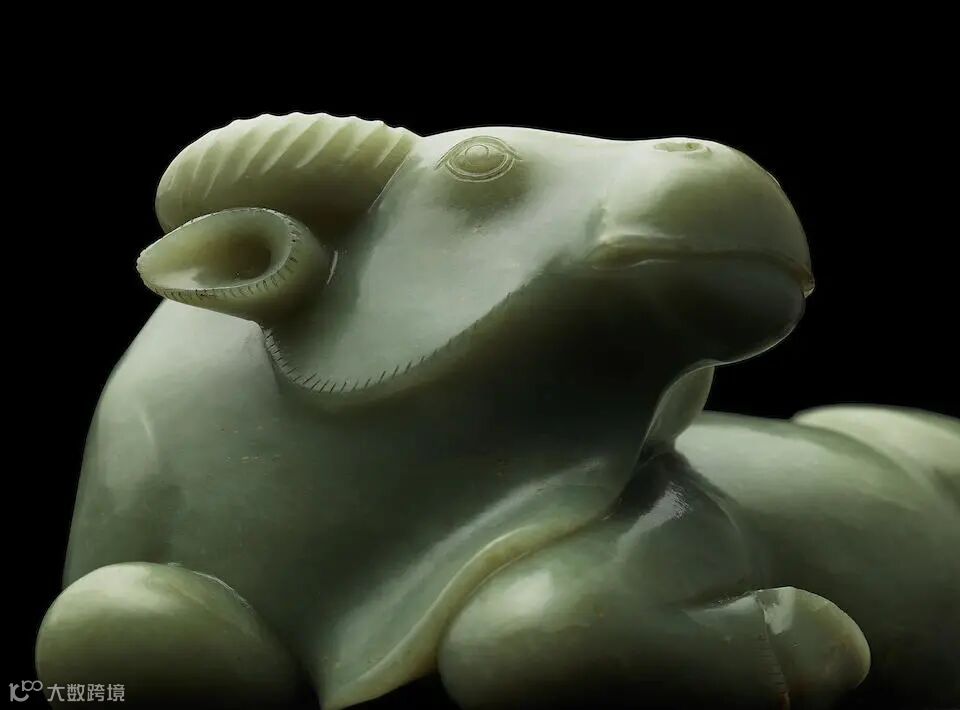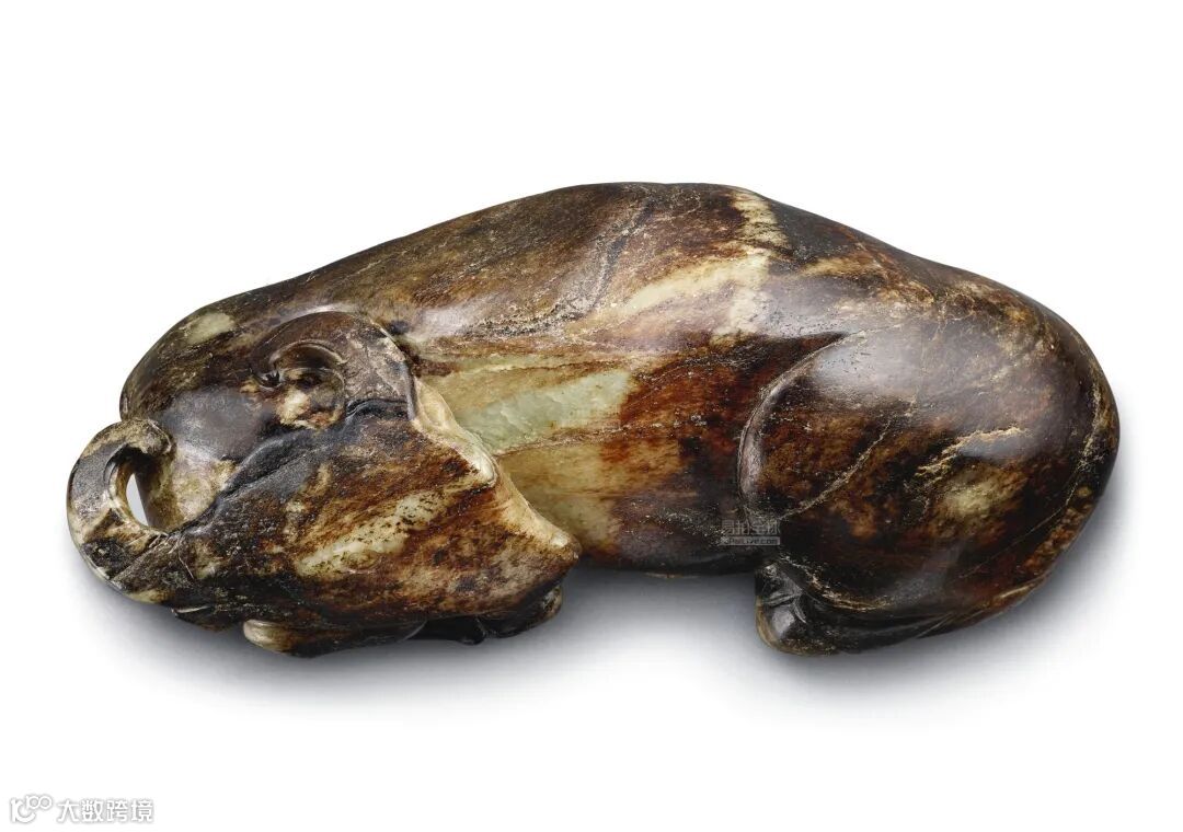 此卧牛之雕琢风格与工艺,顺应玉材原形,简化造形,仅以寥寥雕琢,巧妙捕捉神韵,回首姿态自然灵动,而不冗赘繁缛。