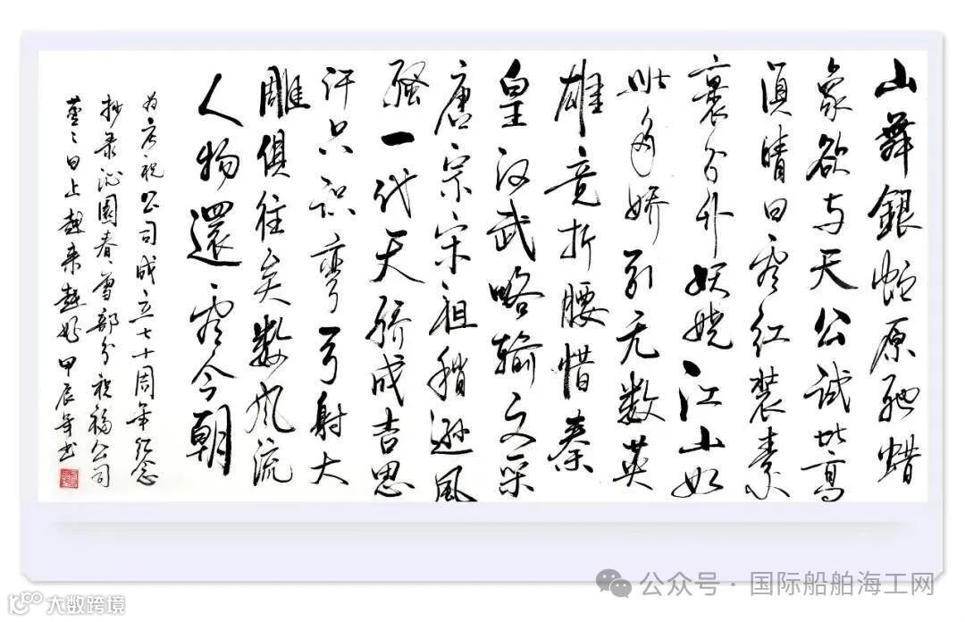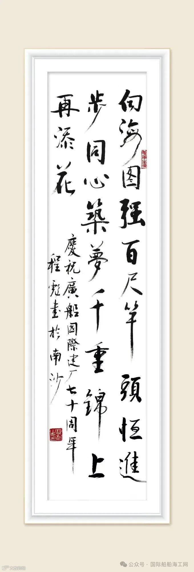 8月1日,中国船舶广船国际举行了庆祝公司建厂70周年辉煌成就展暨职工书画作品展,共展出各类书画作品80余幅。在这次书画作品征集过程中,不仅得到了在职员工的积极响应,也得到了广大退休员工的大力支持,充分体现了大家对公司的深情厚爱,为公司企业文化建设提供了丰富的养分。现将部分作品分期选登以飨读者。
