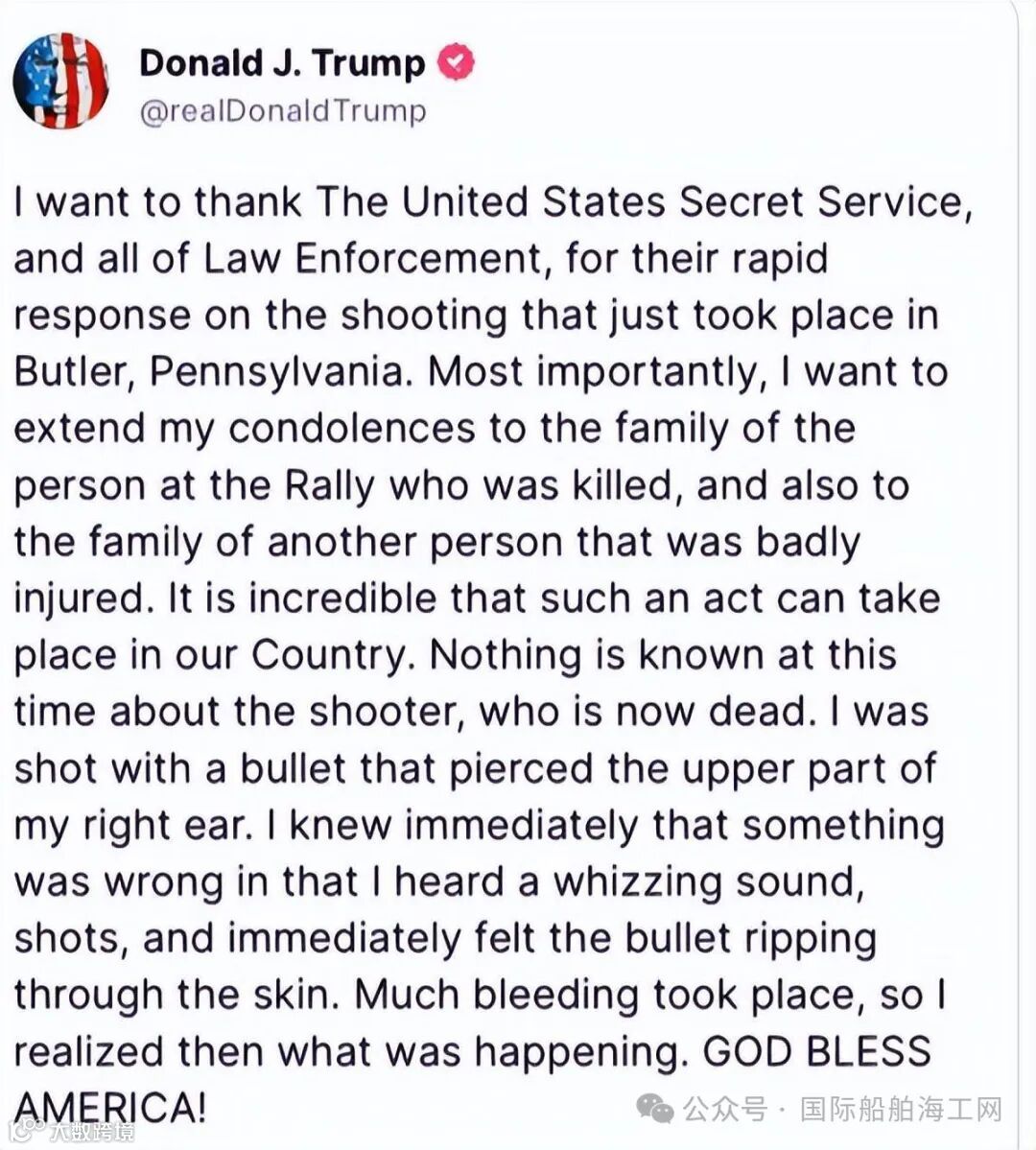 美国媒体援引执法官员的话说,前总统特朗普集会枪击事件已作为刺杀案调查处理。特朗普在社交媒体上发布声明说:“感谢美国特勤局,子弹击穿了我的右耳上部,目前对枪手一无所知。”