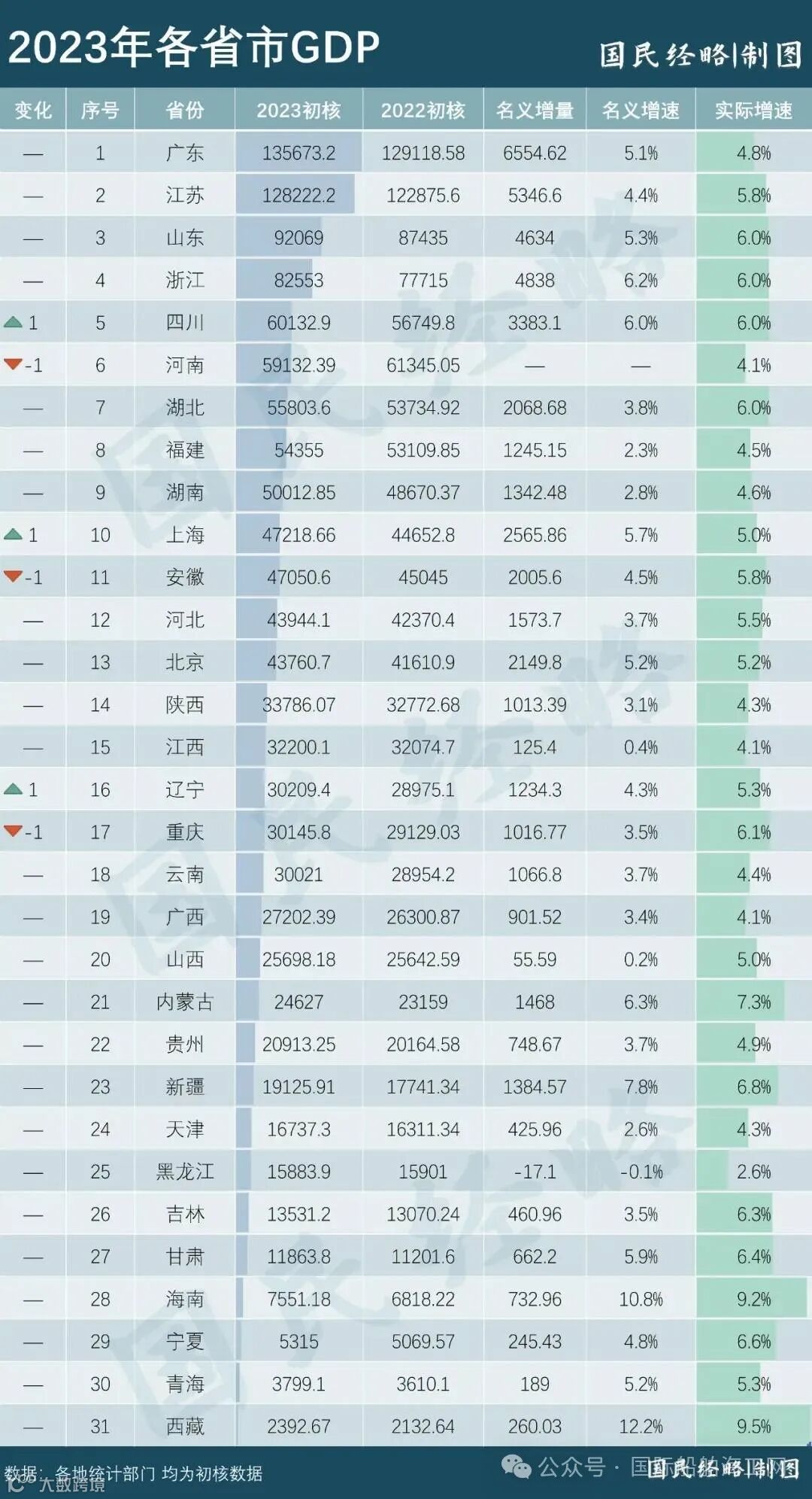 2023年中国大陆31省市GDP总量排名榜
