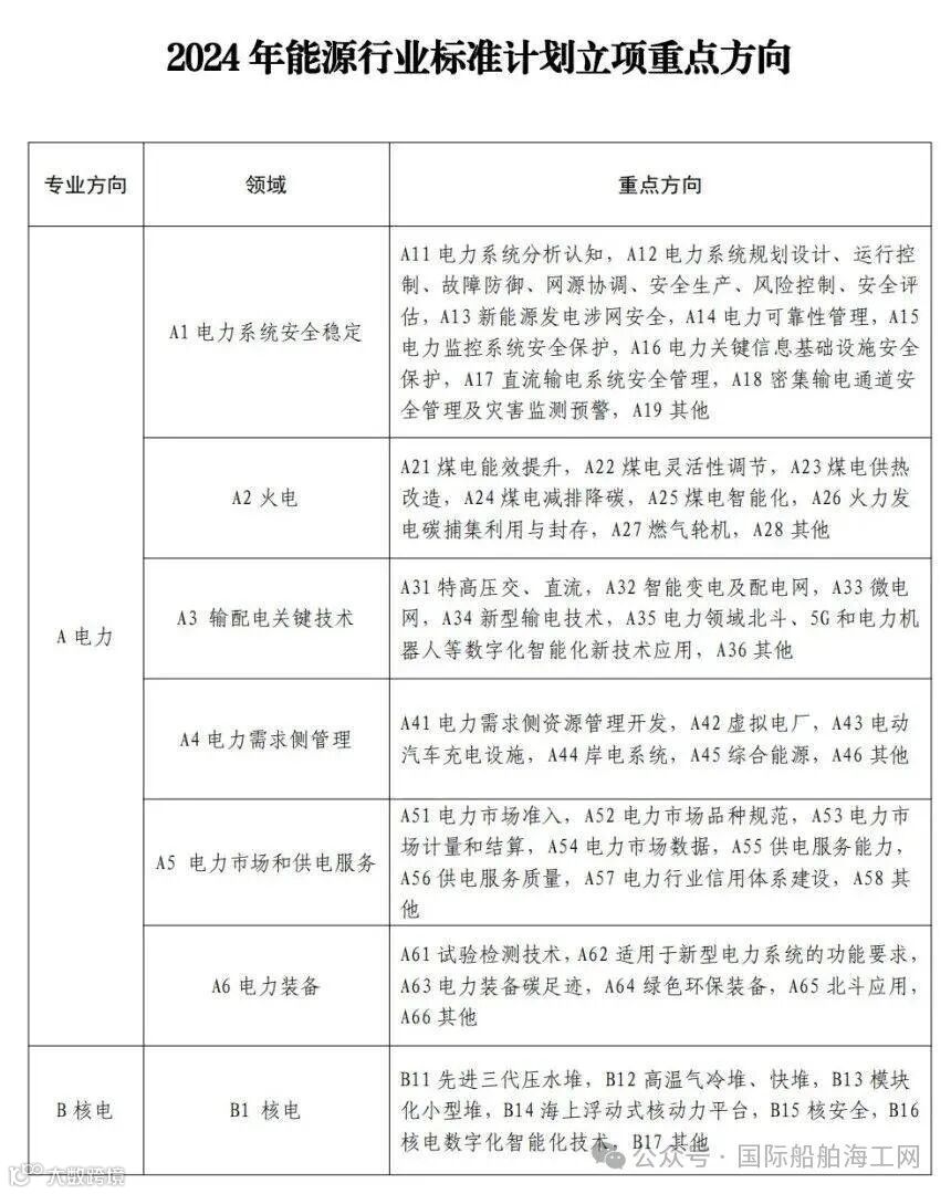 其中2024年能源行业标准计划立项重点专业方向包括电力、核电、煤炭、油气、新能源和可再生能源、新型储能及氢能,其中D41碳捕集,D42碳输送,D43碳利用与封存,D44环境,健康和安全评价,D45其他;