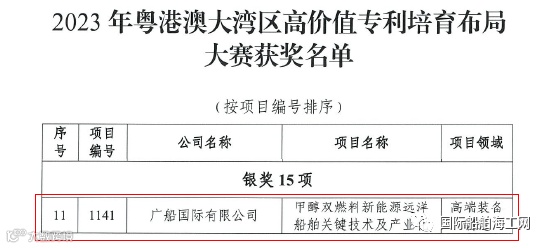 12月22日,2023年粤港澳大湾区高价值专利培育布局大赛公布获奖名单,中国船舶集团旗下广船国际参赛项目“甲醇双燃料新能源远洋船舶关键技术及产业化”荣获大赛银奖。