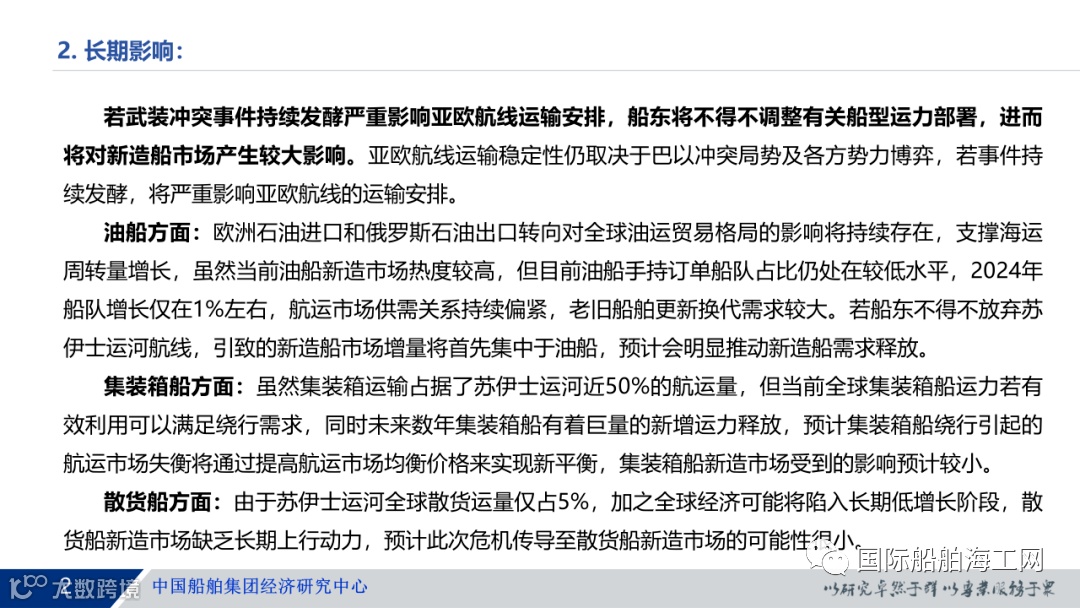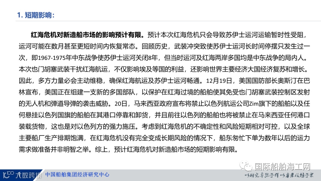 2023年12月初,巴以冲突再次升级,胡塞武装宣布禁止任何前往以色列的船舶在红海和阿拉伯海航行,禁令适用于任何国籍的船舶。红海成为战区,苏伊士运河航线再次被扼住了“咽喉”,对短期航运费率产生了较大的影响,引起了业界的极大关注。基于此,我们分析了本次红海事件对于新造船市场的影响,供造船业各参与主体参考。