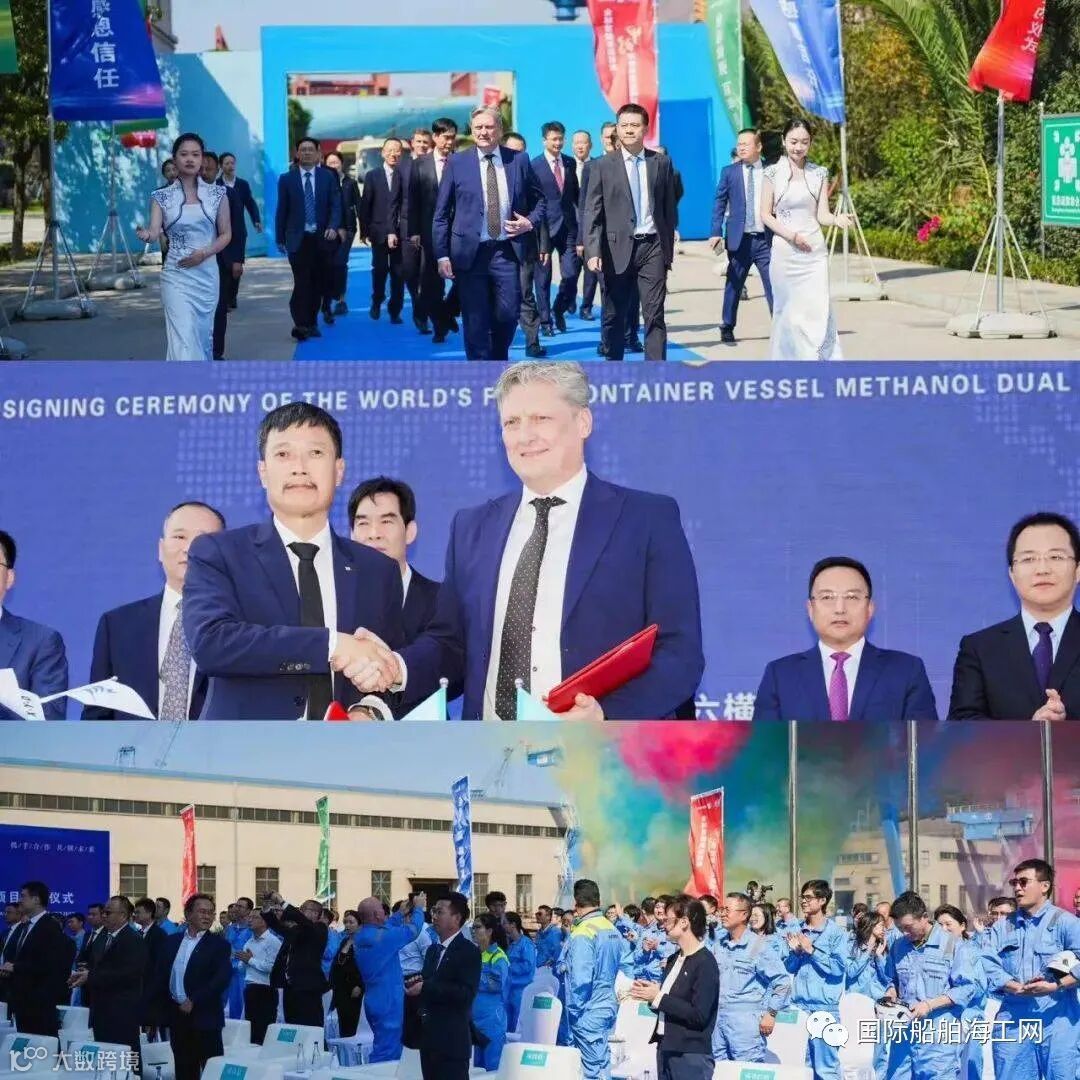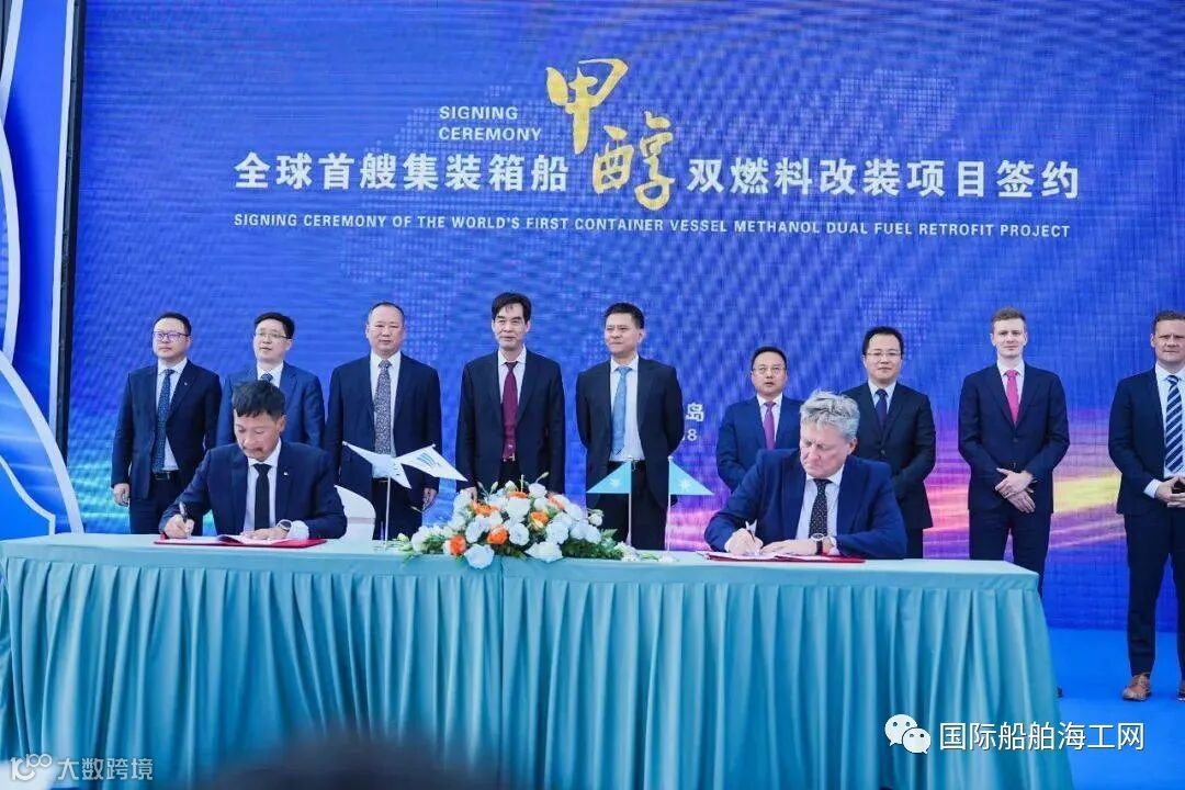 10月18日,全球首艘集装箱船甲醇双燃料改装项目签约仪式在浙江省舟山市鑫亚船舶修造有限公司(下称鑫亚)隆重举行。马士基集团高级采购总监Brian Voldsgaard和鑫亚总经理夏松康代表双方签署合作协议。舟山市委常委、副市长韩峻、普陀区区长徐炜波、市经信局局长蔡志军、六横管委会主任张海斌、马士基集团采购总监张剑及高级采购经理Felix Bader、曼恩公司中国区服务总经理Martin Lyager Hansen、鑫亚董事长周亚国等嘉宾出席该仪式。