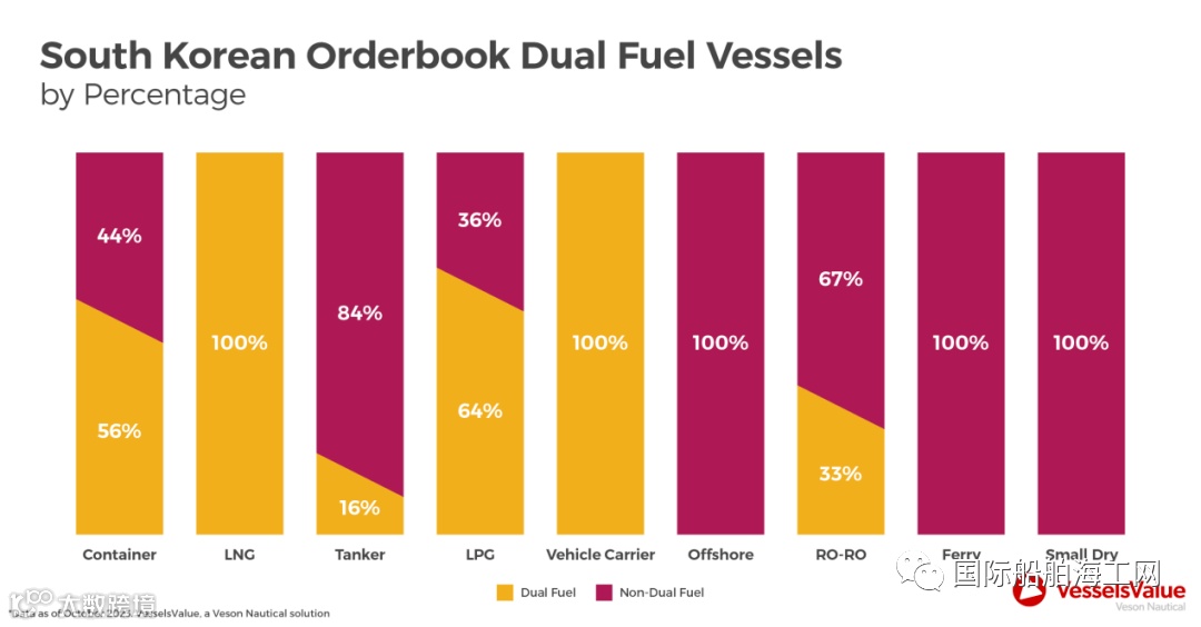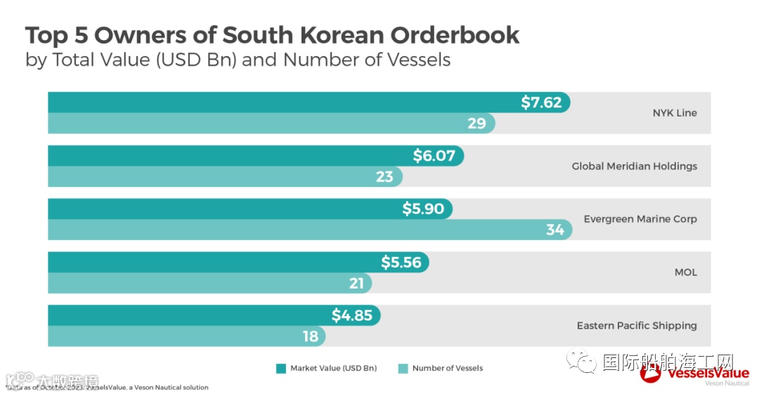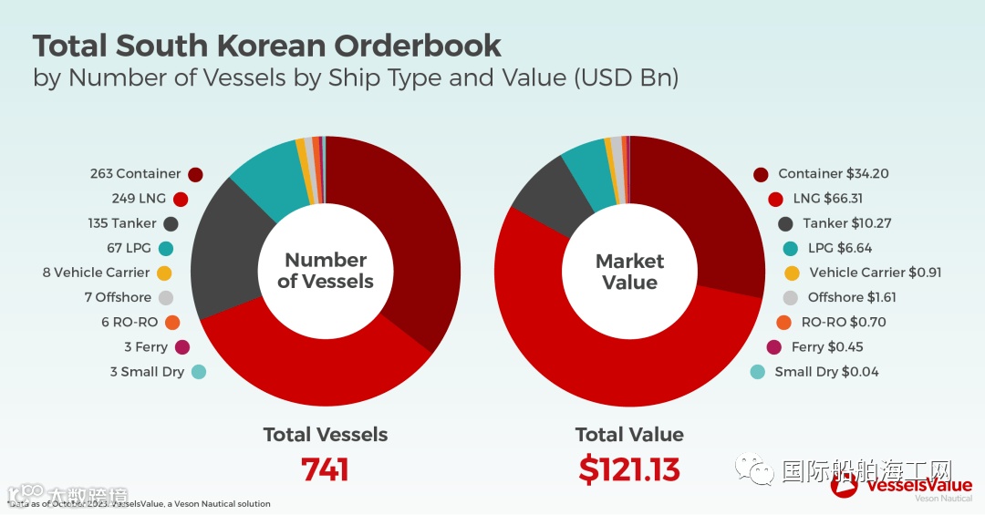 VesselsValue称,集装箱是韩国最受欢迎的订造船舶,共有263 艘,总价值达342 亿美元。
