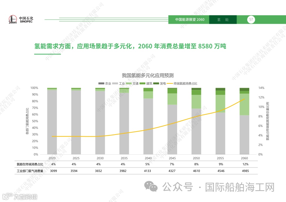 报告第七章指出,在氢能供应方面,化石能源制氢低碳转型和电解水制氢规模化扩张是产业发展主线,在氢能需求方面,应用场景趋于多元化,2060年消费总量增至8580万吨。