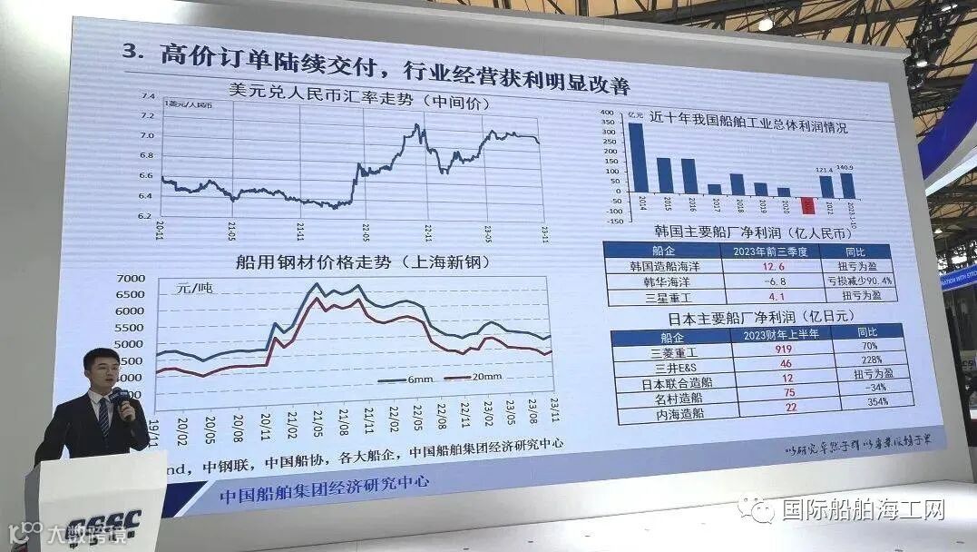 2023年12月7日,中国船舶集团经济研究中心刘炀在上海海事展中国船舶集团公司展台做了“关于全球造船市场发展形式和展望”的报告,就大家关注的热点问题进行了分析研判。