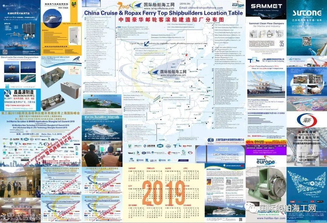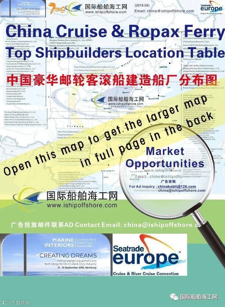 总部上海的国际船舶海工网基于多年来编辑发布中国造船地图的经验,于2029年9月11日在德国汉堡SMM展览馆内同期开幕的2019欧洲邮轮展(Cruise & River Cruise Convention)和德国首届邮轮内饰内装展(www.marineinteriors-expo.com)的展会上,首创性成功发布了国际上第一份“中国邮轮客滚船造船厂分布图”。