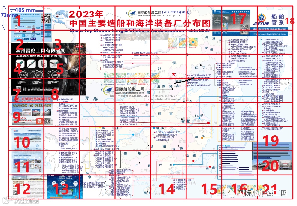 上图示2023版免费赠送地图目前正在开始编辑广告征集,数字为满一格(尺寸为105×74 mm 宽*高),字母为半格(尺寸为105×37 mm 宽*高),都是3000元一格位置,900元一格大小也可在地图背面选择发布。该图在会上和会后开始免费赠送。之后,将在新技术时代平台和国际船舶海工网参加的任何会上继续免费赠送。(邮寄索取该图需要付费物流处理,298元2份,有发票。 咨询:meetchinamkt@163.com 或者 china@ishipoffshore.com