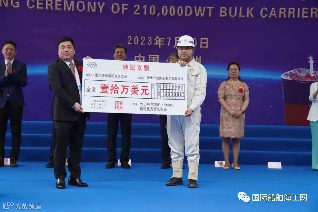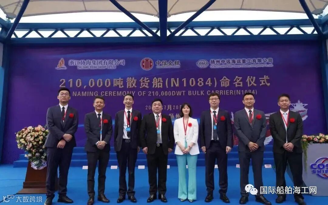 7月20日,中信金租/协海集团在扬州中远海运重工新建的21万吨散货船N1084轮在扬州举行了隆重的命名仪式。新船教母李佩霞女士将N1084轮命名为“XH META”,并致香槟礼,中信金租、扬州中远海运重工、ABS船级社、浙江协海集团等相关单位的领导和嘉宾出席命名仪式。