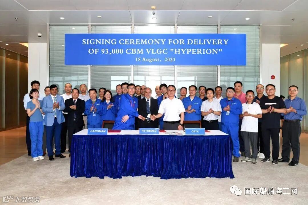 签字交付当日,船东给建造团队赠送了100辆自行车。作为在江南造船订购了22艘船舶的老客户PETREDEC曾在该船命名时表示:“我们对江南高质量产品高度认可,对江南管理者和江南员工充满敬意。江南建造交付的93K系列称得上是整个行业内运营中的最环保、最清洁的船舶。也正因为如此,江南才成为PETREDEC在中国唯一有新造船项目合作的船厂。” (相关命名新闻请点击下方图片)