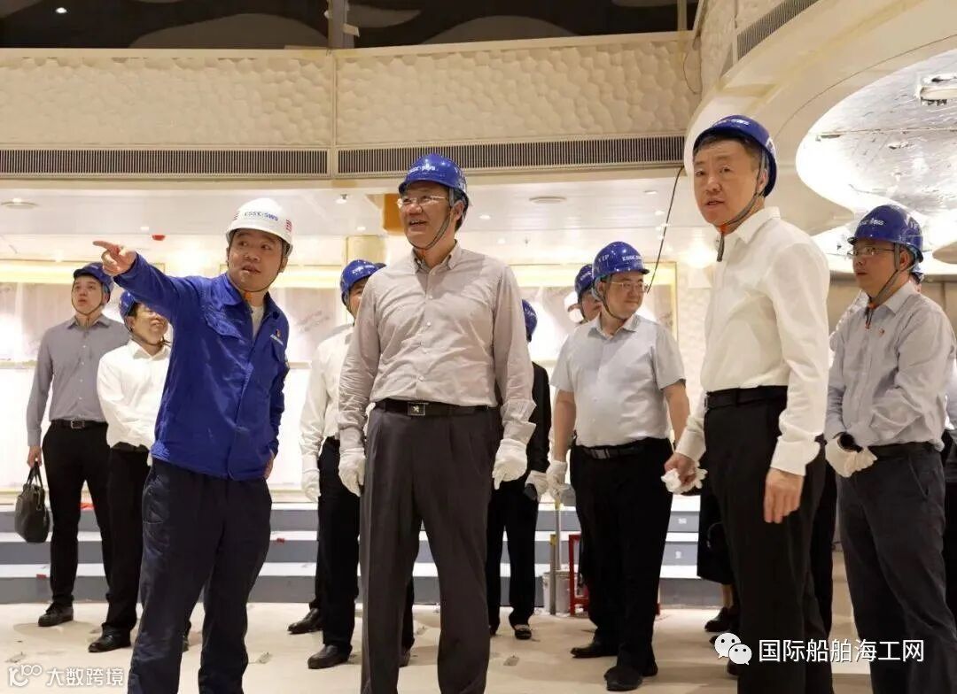 7月7日,商务部部长王文涛一行赴外高桥造船正在建造之中的首艘国产大型邮轮“爱达·魔都号”,调研上海自由贸易试验区有关政策落地情况。中国船舶集团党组书记、董事长温刚陪同调研。