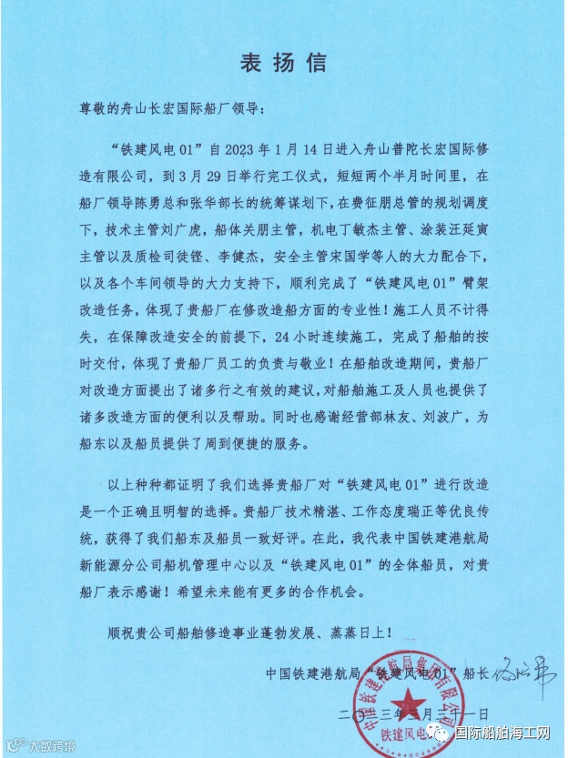 早在船舶入厂前,公司就专门成立了“铁建风电01”海工船舶改造大项目组。项目组分工协作,分别对“铁建风电01安全进港”、“铁建风电01码头安全插桩”、“460吨大臂拆装吊运”、“大臂搁架制作以及搁架反面加强”、“430吨新大臂安全吊运安装”等生产大节点做了详细的策划准备。整个改装项目各大生产节点均提前保质完成。获得船东高度赞誉并收到表扬信。