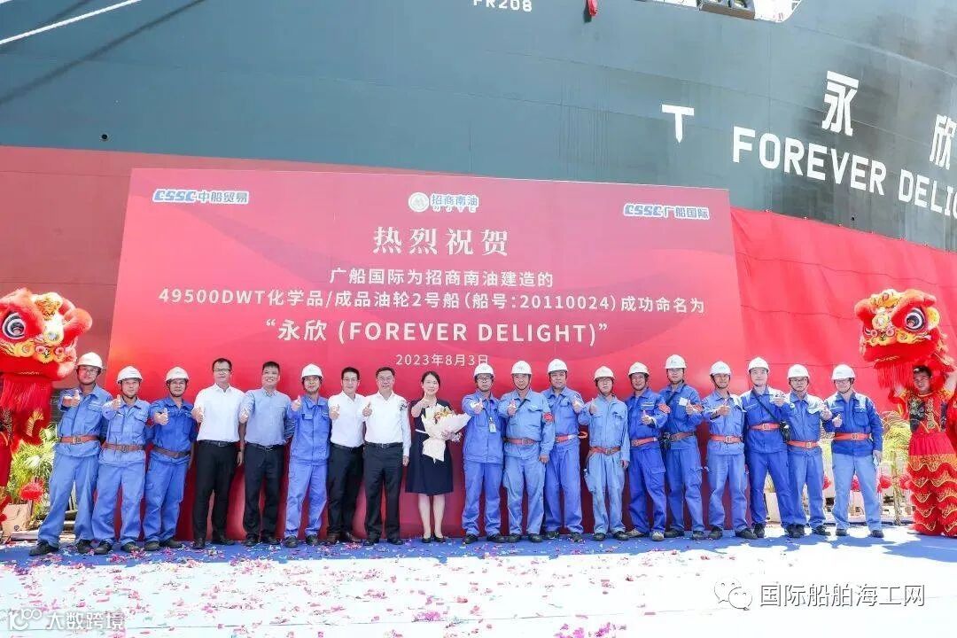 8月3日,中国船舶集团旗下广船国际联合中船贸易为招商局南京油运股份有限公司建造的4.95万吨化学品/成品油船2号船命名交付。该船也是广船国际为招商南油建造的12艘MR系列船的收官之作。