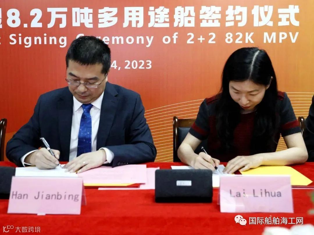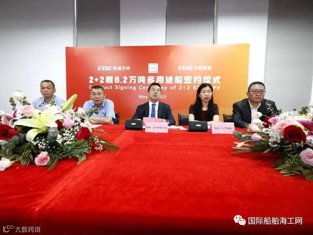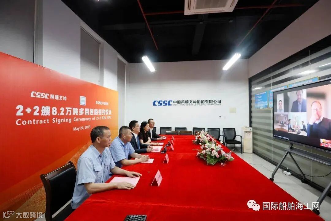 近日,中国船舶集团属下中船黄埔文冲船舶有限公司联合中国船舶工业贸易公司与挪威Grieg集团签署2+2艘8.2万吨多用途船建造合同,船东公司、中船贸易公司、黄埔文冲公司等单位领导共同出席此次云签约仪式。