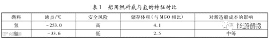 在同等质量下,液氨的体积约为氨气的1/800,因此相比氨气,对空间要求高的船舶更适合运输液氨。世界上现有的700多艘液化石油气(LiquefiedPetroleumGas,LPG)运输船都可用来运输氨,这相当有利于氨燃料未来的推广。氢则不同,其具有易泄漏、易扩散和易燃易爆等特点,且其沸点为-253℃,液氢具有超低温特性,在船上应用的风险较高。因此,液氢的储存和运输也是目前船用氢燃料发展的主要阻碍之一。