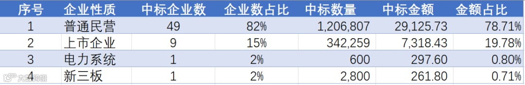 综合各中标企业资本性质,9家上市企业合计中标金额7,318.435万元,市场份额占比约19.78%。