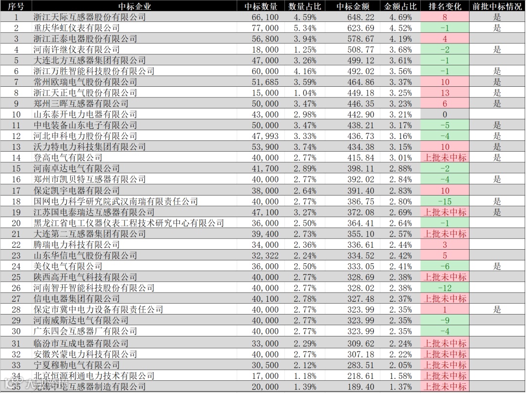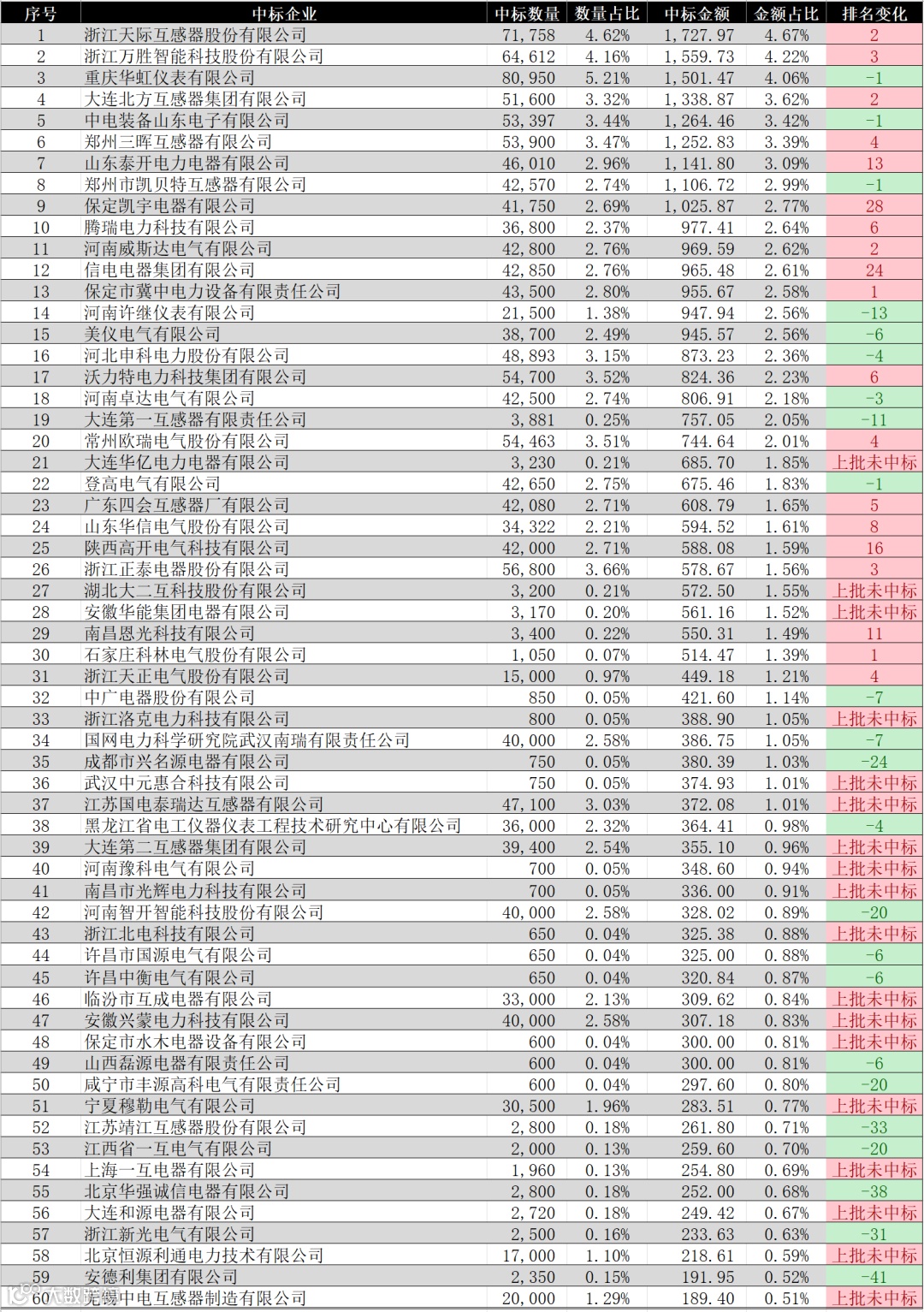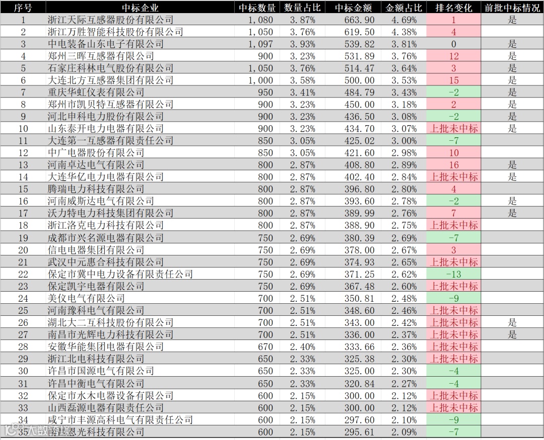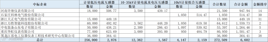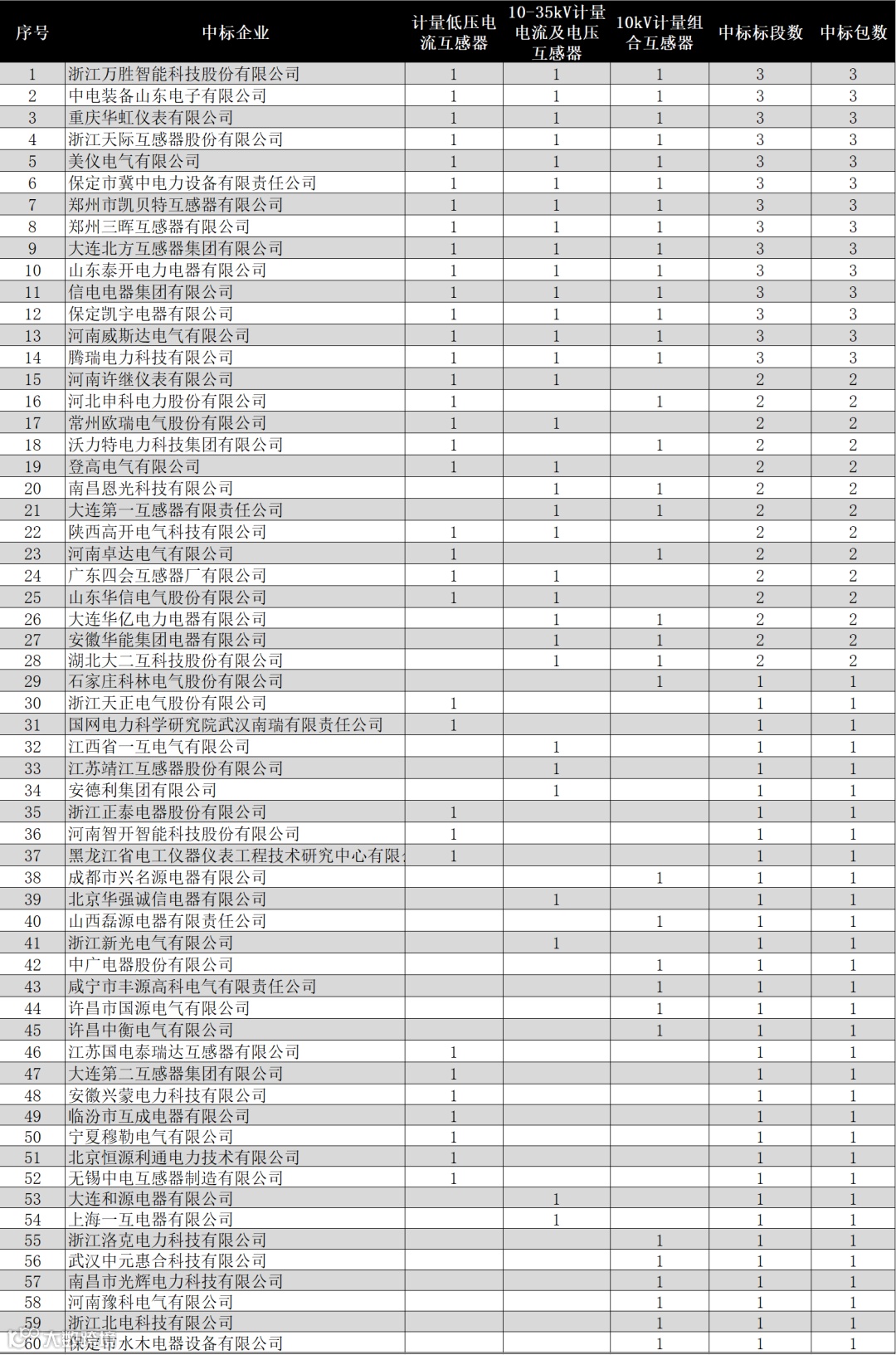 根据公布的信息,本次招标最终总中标金额为37,003万元。102个包共由60家企业实现中标,其中计量低压电流互感器分标35个包由352家企业中标;10-35kV计量电流及电压互感器分标32个包由32家企业中标;10kV计量组合互感器分标35个包由35家企业中标。本次项目中标金额前三名企业为天际互感器、万胜智能、华虹仪表、。