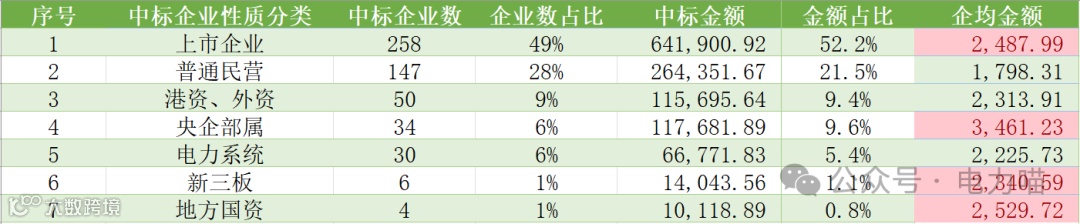 从中标企业数量看,上市企业最多,共258家,占比约49%。