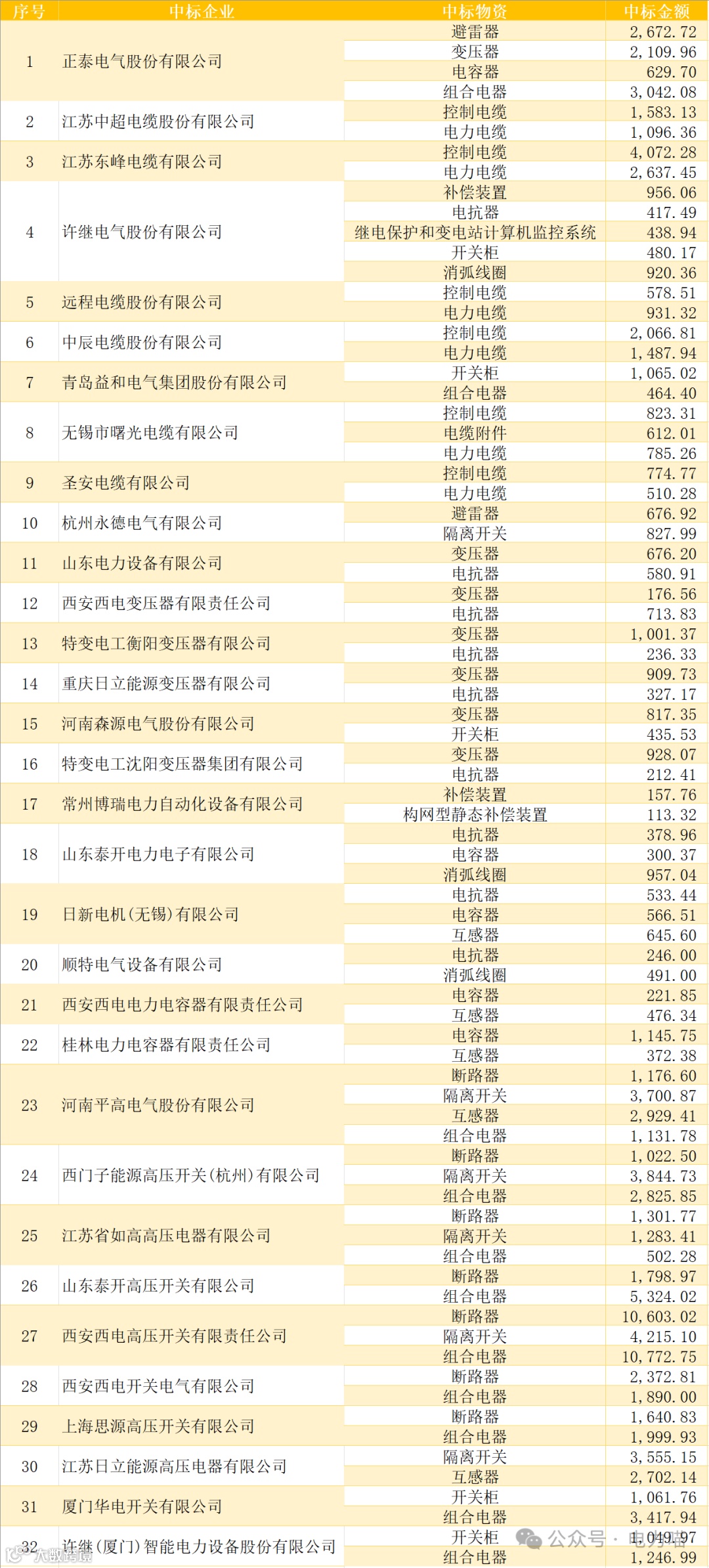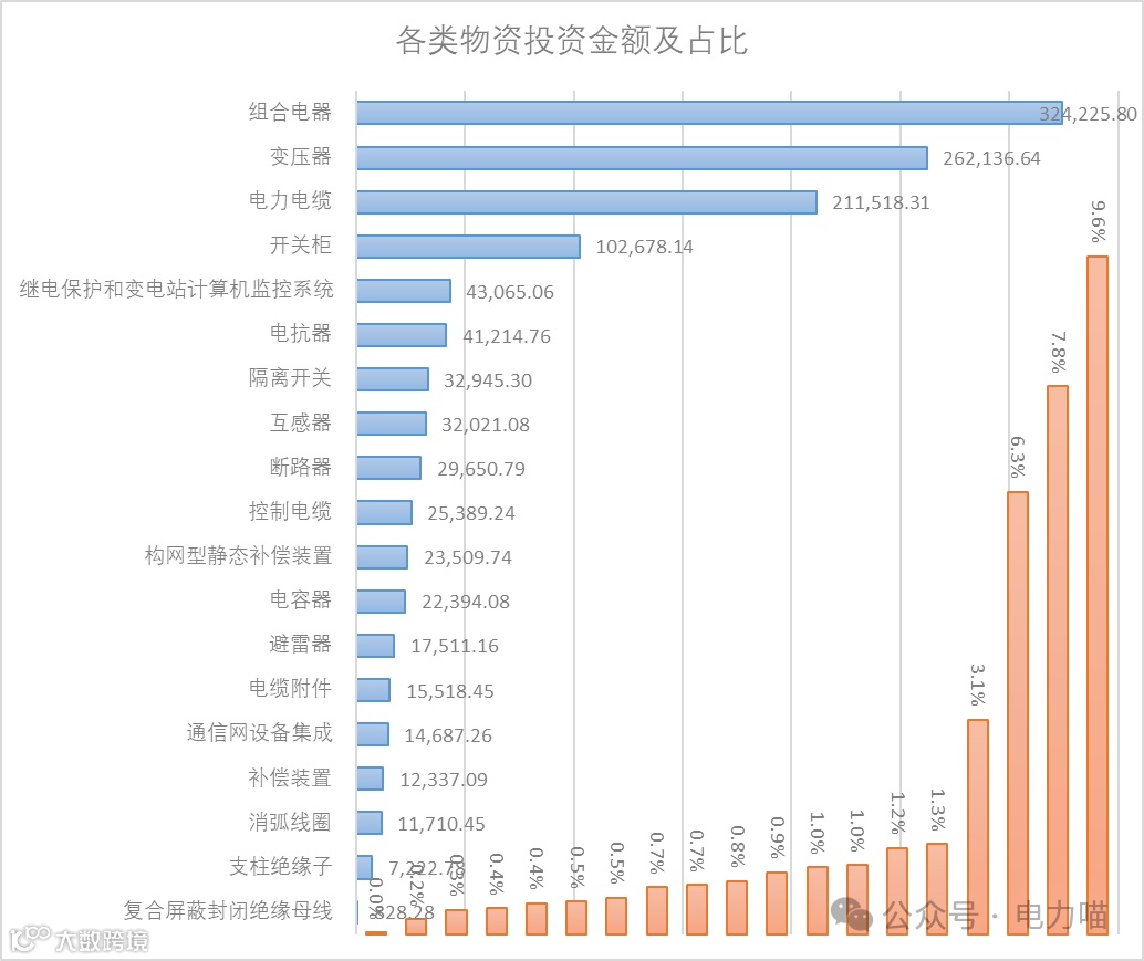根据最终中标结果,组合电器、变压器、电力电缆、开关柜等4类物资标段在本项目的投资金额超过5亿元,这4类物资投资金额占本次项目投资总金额的73%。