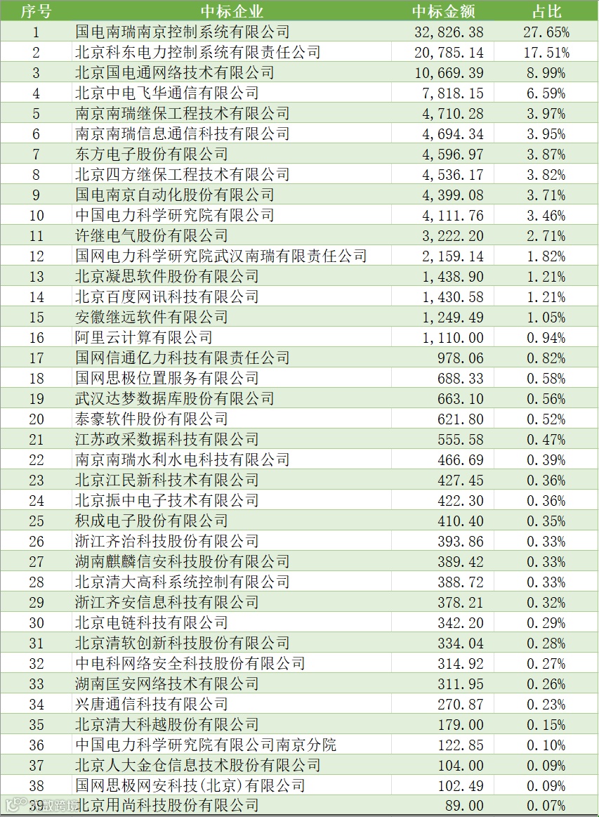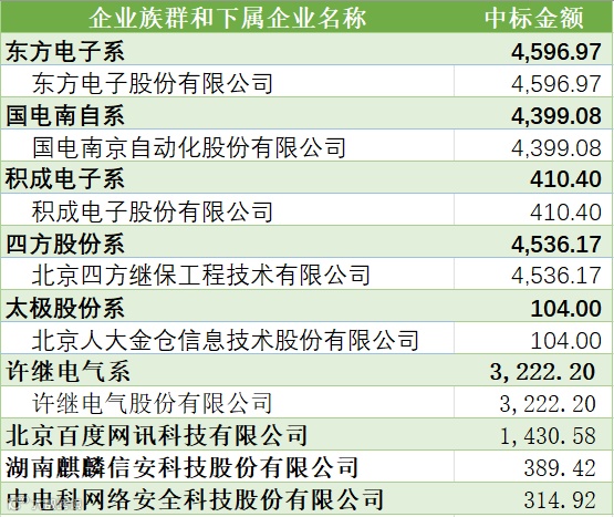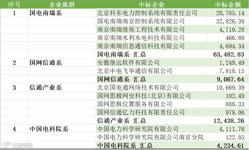 合计中标金额位列前茅的企业族群为:国电南瑞系(共5家,中标63,482.83万元,占比53.5%)。